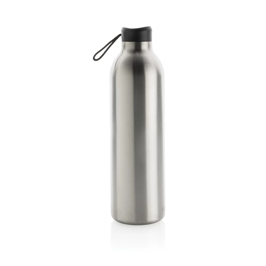 Butelka termiczna 1000 ml, wykonana ze stali nierdzewnej pochodzącej z recyklingu, całkowita zawartość materiałów z recyklingu obliczona na podstawie wagi całkowitej przedmiotu: 97%, podwójne ścianki z próżnią pomiędzy, pasuje do większości uchwytów samochodowych, w pudełku z papieru kraftowego z certyfikatem FSC®, pudełko można wykorzystać jako stojak na telefon lub doniczkę, utrzymuje temperaturę napojów gorących do 20 godzin oraz zimnych do 20 godzin