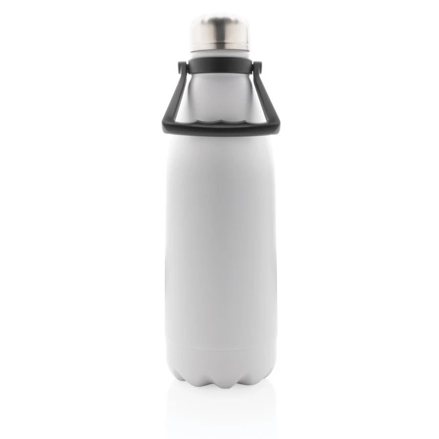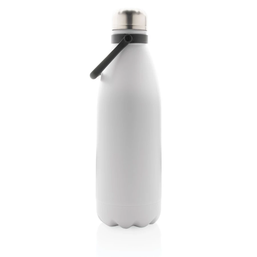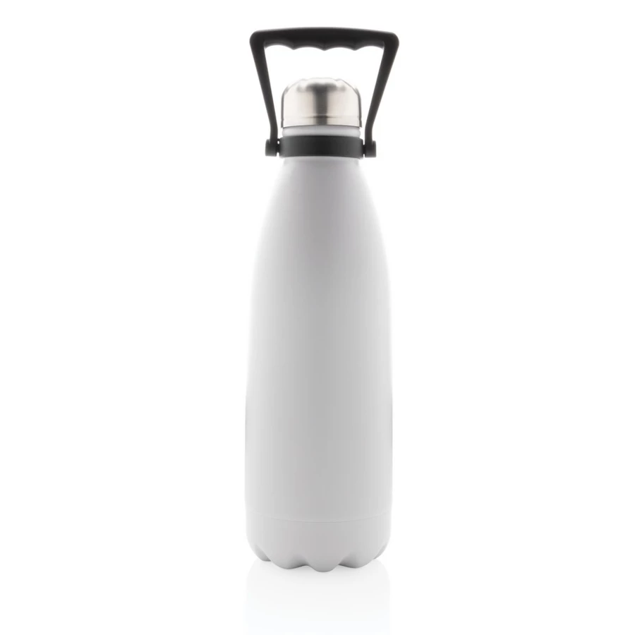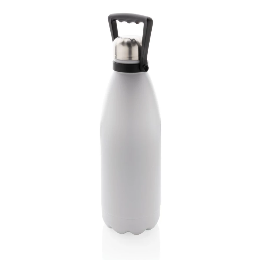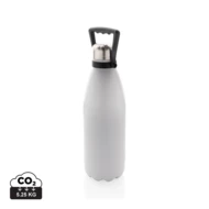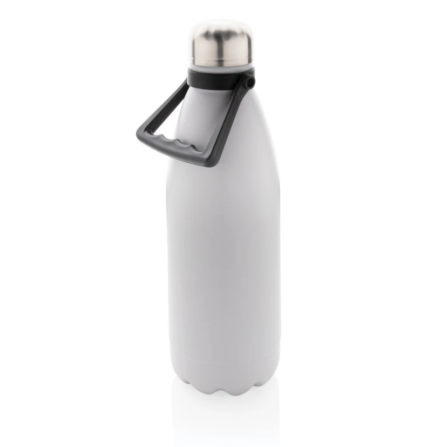 Butelka termiczna 1500 ml z uchwytem, proszkowa powłoka, wykonana ze stali nierdzewnej pochodzącej z recyklingu, całkowita zawartość materiałów z recyklingu obliczona na podstawie wagi całkowitej przedmiotu: 88%, podwójne ścianki z próżnią pomiędzy, w opakowaniu z certyfikatem FSC®, utrzymuje temperaturę napojów gorących do 20 godzin oraz zimnych do 15 godzin