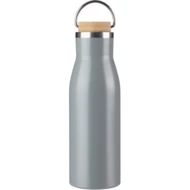Butelka termiczna 500 ml, zakrętka z bambusowym elementem i metalowym uchwytem ułatwiającym noszenie lub przypięcie, ikona stali z recyklingu na produkcie, produkt wykonany ze stali nierdzewnej recyklingu