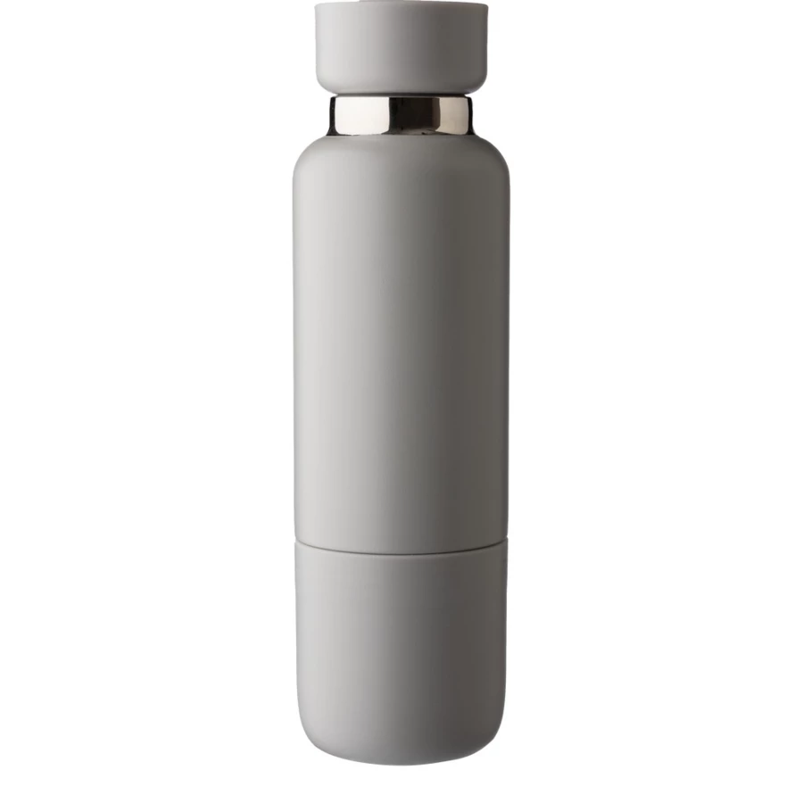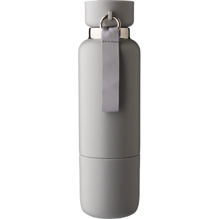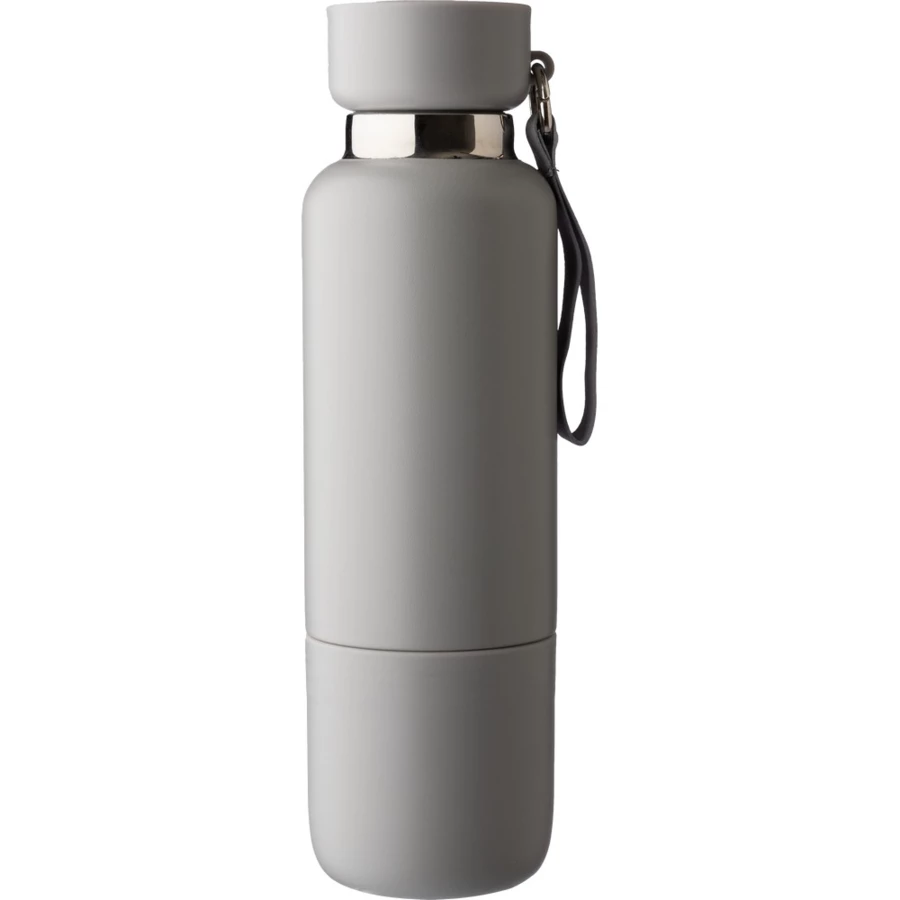 Butelka termiczna 500 ml, posiada podwójne ścianki ze stali nierdzewnej z próżnią między ściankami, co spowalnia oddawanie temperatury na zewnątrz, zachowując funkcje termosu, zakrętka funkcjonująca jako kubek umożliwia wygodne i higieniczne dzielenie się napojem, uchwyt ułatwiający noszenie, matowe wykończenie, produkt wykonany ze stali nierdzewnej, zakrętka z PP, uchwyt z poliestru, utrzymuje temperaturę napojów gorących do 20 godzin +leakproof