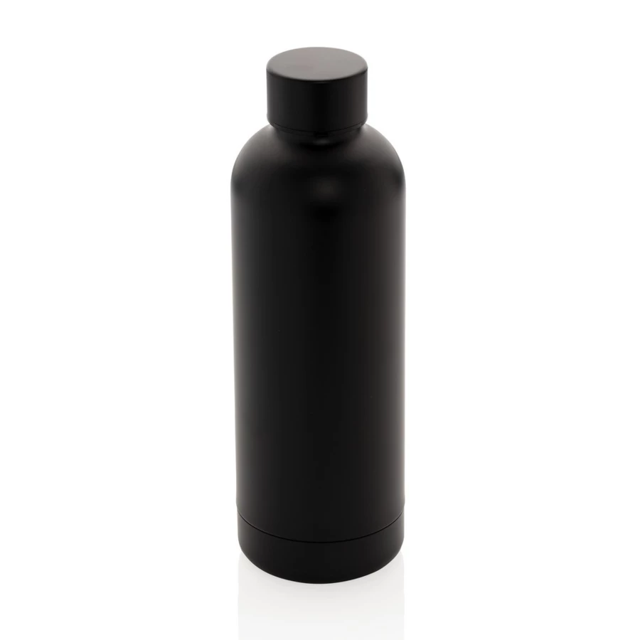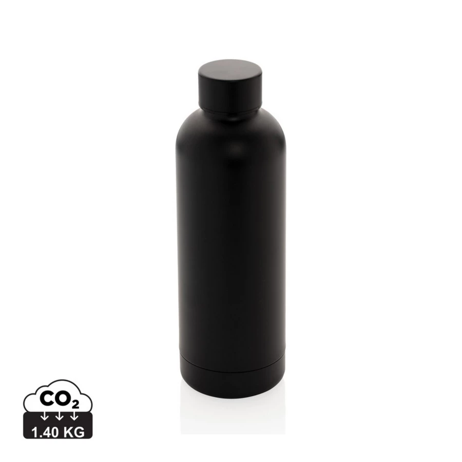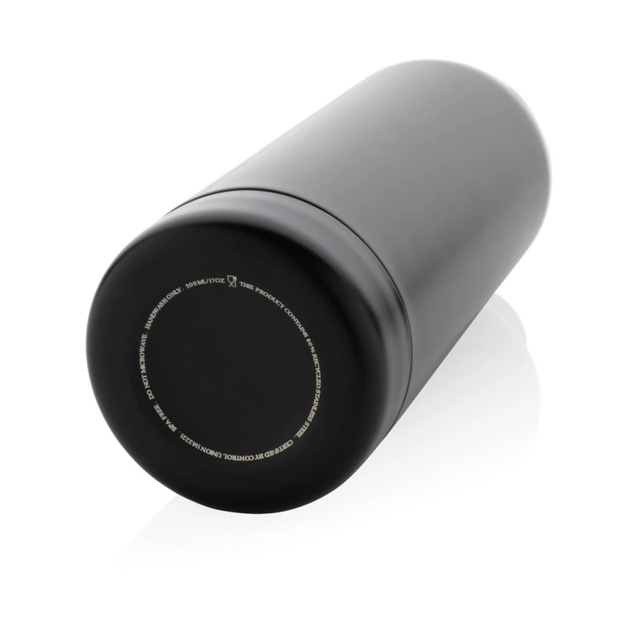 Butelka termiczna 500 ml, wykonana z materiałów pochodzących z recyklingu z certyfikatem RCS, całkowita zawartość materiałów z recyklingu obliczona na podstawie wagi całkowitej przedmiotu: 80%, podwójne ścianki z próżnią pomiędzy, minimalistyczne wykończenie, w opakowaniu z papieru kraftowego, utrzymuje temperaturę napojów gorących do 5 godzin oraz zimnych do 15 godzin