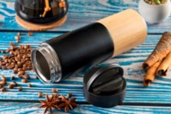 Miedziana butelka izolowana próżniowo z dolną częścią wykonaną z bambusa, szczelnym wieczkiem, uchwytem do przenoszenia i pojemnością 500 ml.