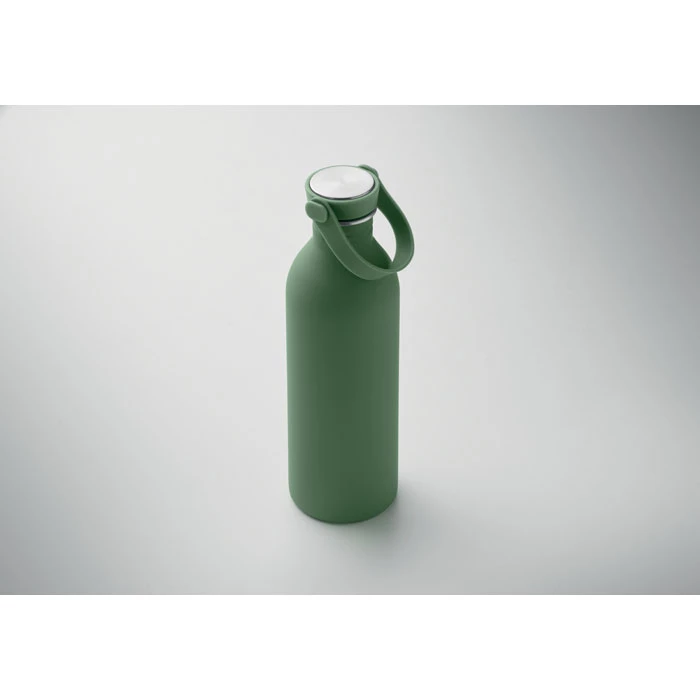 Jednościenna butelka 90% stal nierdzewna z recyklingu 10% stal nierdzewna. Gumowe wykończenie. Pokrywka z PP i SS sylikonowy uchwyt. 500 ml. Butelka jednościenna, może występować przenoszenie ciepła.