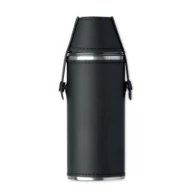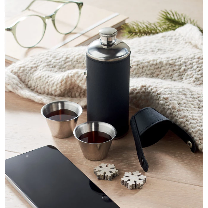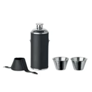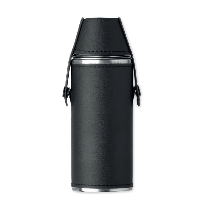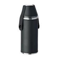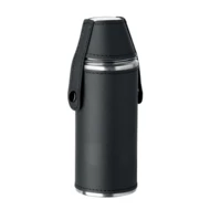 Butelka ze stali nierdzewnej z powierzchnią ze skóry PU i 2 kubkami ze stali nierdzewnej o pojemności 20 ml w pokrywie. Pojemność: 230 ml.