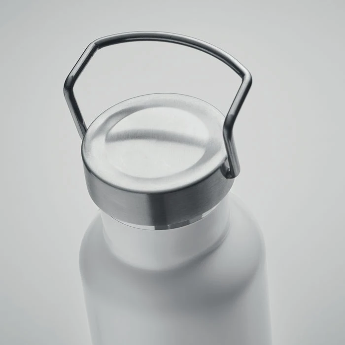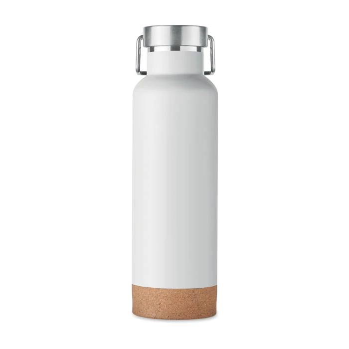 Dwuścienna, izolowana próżniowo butelka z recyklingowanej stali nierdzewnej z pokrywką z uchwytem i korkową podstawą. Nie przecieka. Pojemność: 500 ml. (90% stali nierdzewnej z recyklingu i 10% stali nierdzewnej).