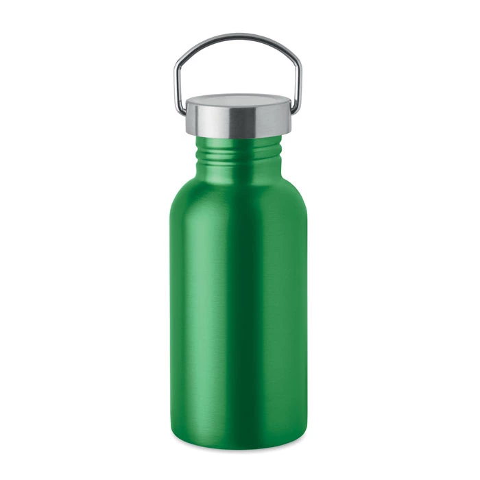 Jednościenna butelka z recyklingowanej stali nierdzewnej (90% stali nierdzewnej z recyklingu i 10% stali nierdzewnej) z pokrywką i uchwytem. Nie przecieka. Pojemność: 500 ml. Ponieważ jest to butelka z pojedynczą ścianką, może dochodzić do wymiany ciepła.