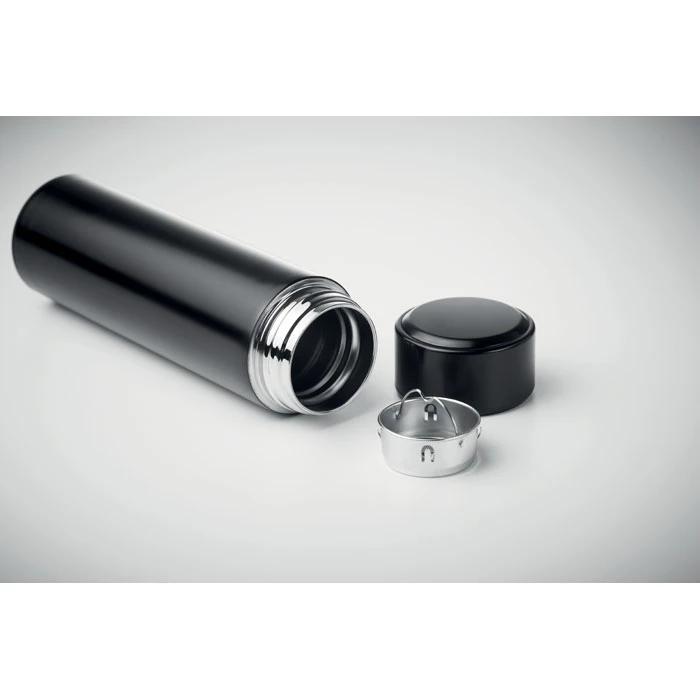 Butelka ze stali nierdzewnej, posiada podwójne ścianki z izolacyjną komorą próżniową. Wbudowany dotykowy termometr LED na pokrywie i zaparzacz do herbaty.Zawiera 1 wymienną bateria CR2032. Szczelna. Poj. 450 ml. Szczelna.