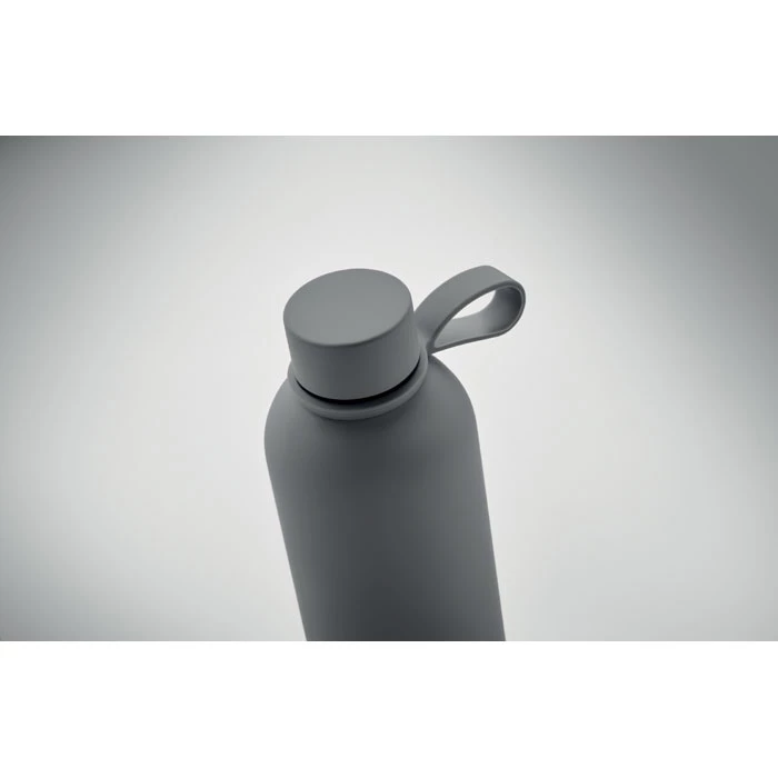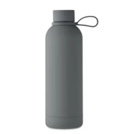 Dwuścienna butelka z izolacją próżniową z recyklingowanej stali nierdzewnej (90% z recyklingowanej stali nierdzewnej i 10% ze stali nierdzewnej) z gumowym wykończeniem i silikonowym uchwytem. Pojemność: 500 ml.