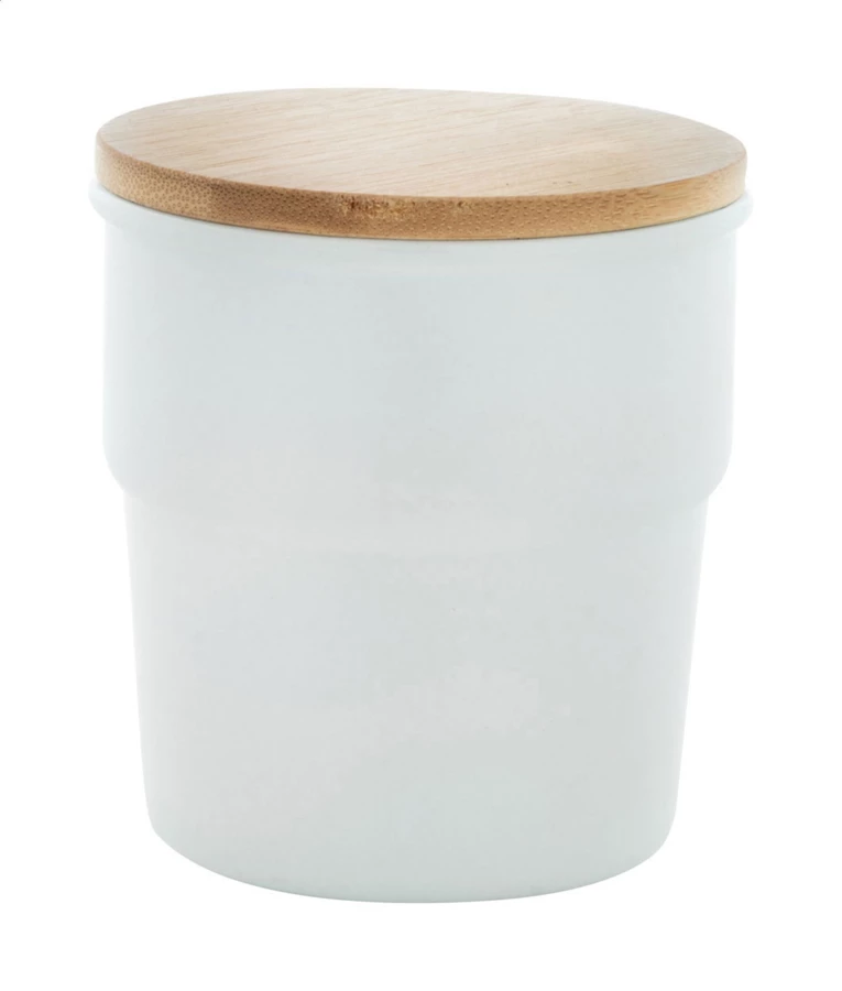 Wysokiej jakości kubek ceramiczny z bambusową pokrywką. Z matowym wykończeniem na zewnątrz i błyszczącym wykończeniem wewnątrz. 240ml. W pudełku z papieru kraft.