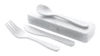 Zestaw 3 sztućców z tworzywa PP w pasującym kolorowym etui. Zawiera widelec, nóż i łyżkę.