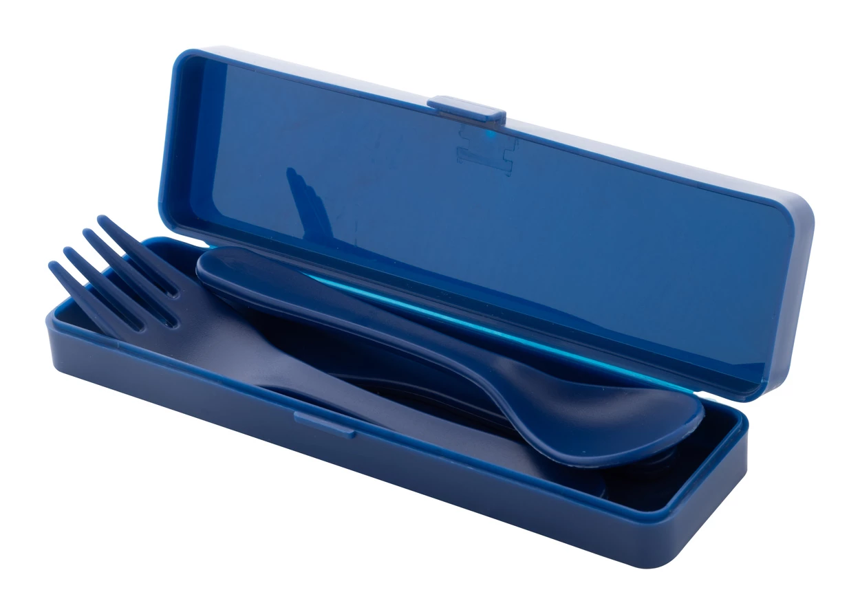 Zestaw 3 sztućców z tworzywa PP w pasującym kolorowym etui. Zawiera widelec, nóż i łyżkę.