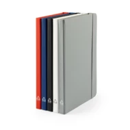 Notatnik A5 wykonany z poliuretanu (35%) i poliuretanu (15%) pochodzącego z recyklingu. Twarda okładka wykonana jest w 100% z kartonu pochodzącego z recyklingu. Zawiera 192 kartki w linie, w 100% z recyklingu, w kolorze kości słoniowej, pasek rozdzielający i gumkę do zamykania notatnika. 138 x 210 mm