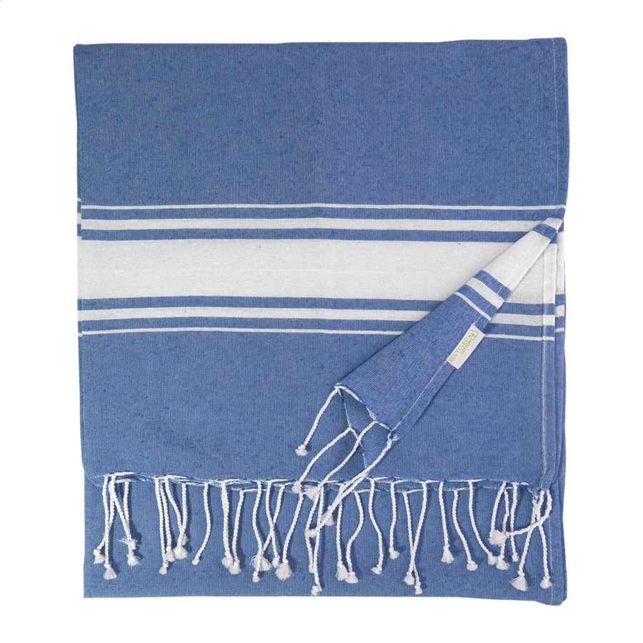 Dwukolorowy ręcznik plażowy typu pareo wykonany w 70% z bawełny pochodzącej z recyklingu i w 30% z poliestru RPET, 180 g/m²