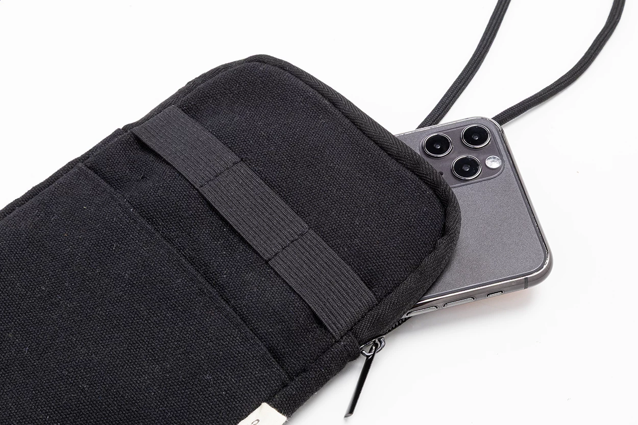 Torba na telefon komórkowy z płótna z recyklingu, z główną komorą zapinaną na zamek, kieszenią z przodu i regulowanym sznurkiem z poliestru RPET. Wykonana w 70% z bawełny z recyklingu i w 30% z poliestru RPET. Z charakterystyczną metką z bawełny z recyklingu.