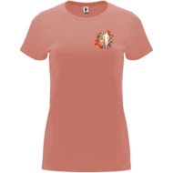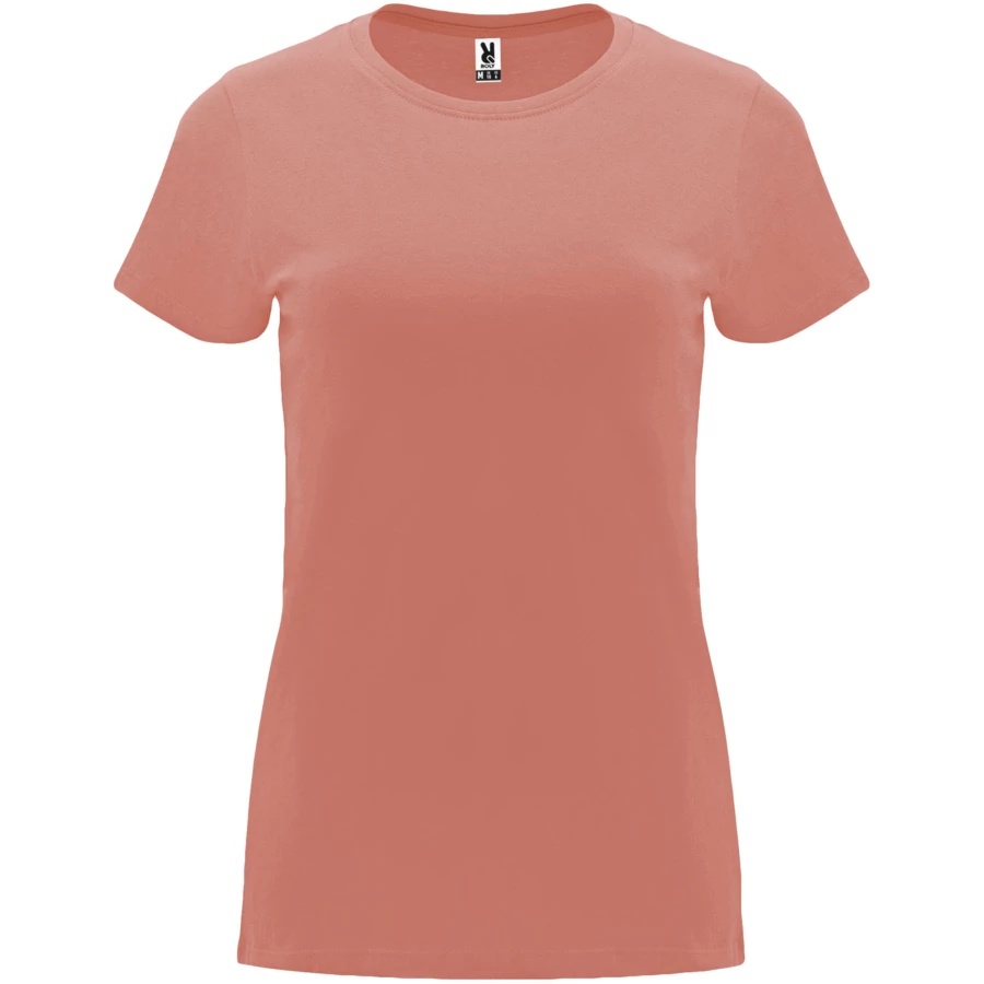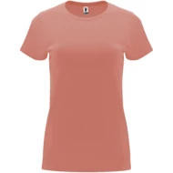Damska dopasowana koszulka z krótkim rękawem. Okrągły prążkowany dekolt 1x1. Wzmocnione, kryte szwy na kołnierzu. Usuwalna metka.
