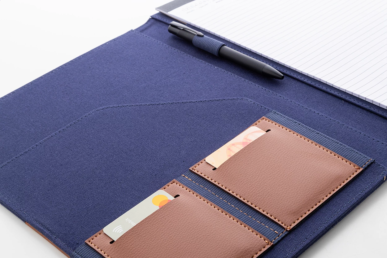 Teczka na dokumenty w formacie A4, wykonana z płótna z recyklingu i skóry PU z recyklingu, z wieloma kieszeniami z przodu i wewnątrz. Zawiera 20-kartkowy notatnik w linie z papieru z recyklingu. 70% bawełny z recyklingu i 30% poliestru RPET.