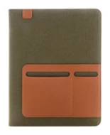 Teczka na dokumenty w formacie A4, wykonana z płótna z recyklingu i skóry PU z recyklingu, z wieloma kieszeniami z przodu i wewnątrz. Zawiera 20-kartkowy notatnik w linie z papieru z recyklingu. 70% bawełny z recyklingu i 30% poliestru RPET.