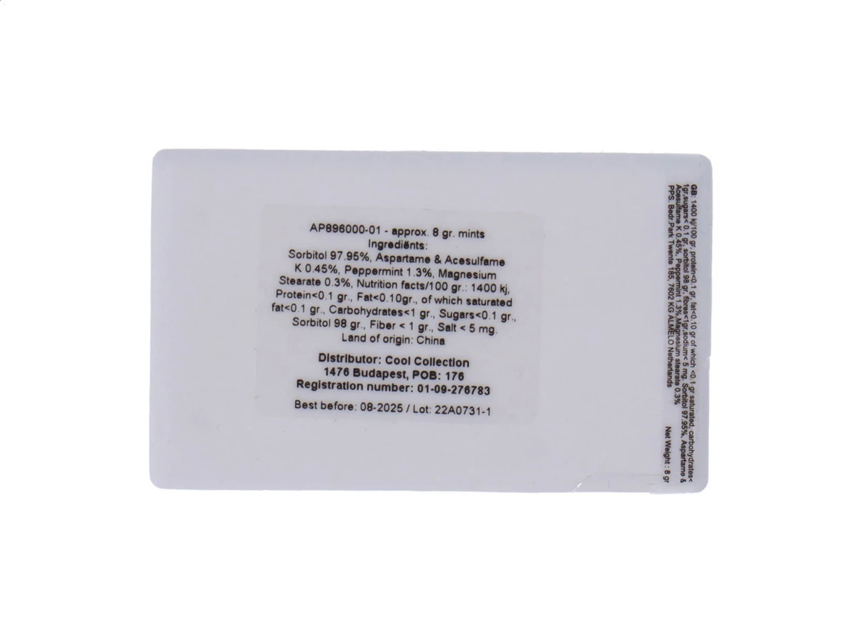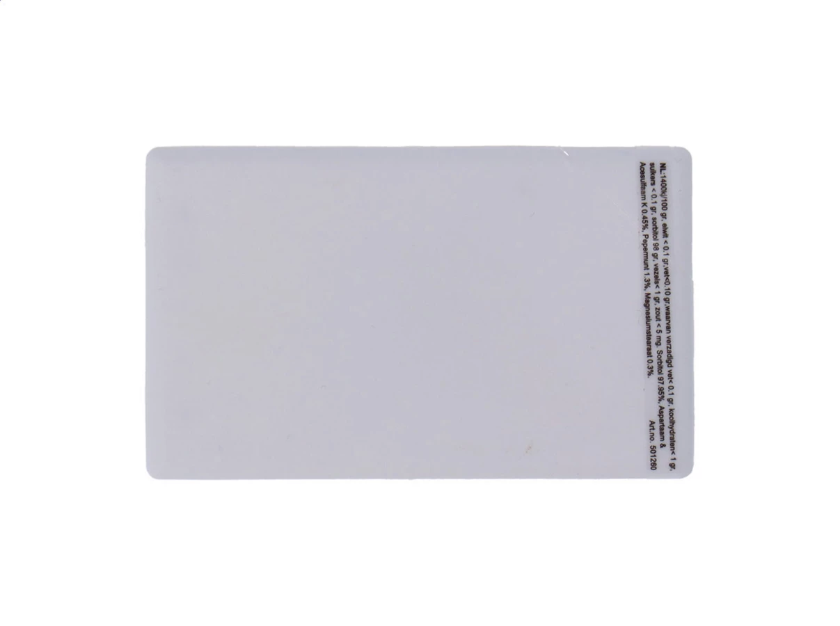 Plastikowe pudełko miętówek w kształcie karty, zawierające ok. 8 g cukierków mentolowych.