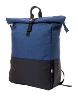 Dwukolorowy, zwijany plecak RPET z zapięciem na sprzączkę, główną komorą zapinaną na zamek, wyściełaną przegrodą na laptopa (15") i tabletem (10"), kieszeniami bocznymi, wyściełanymi plecami i szelkami. Poliester 300D RPET z charakterystyczną metką RPET.