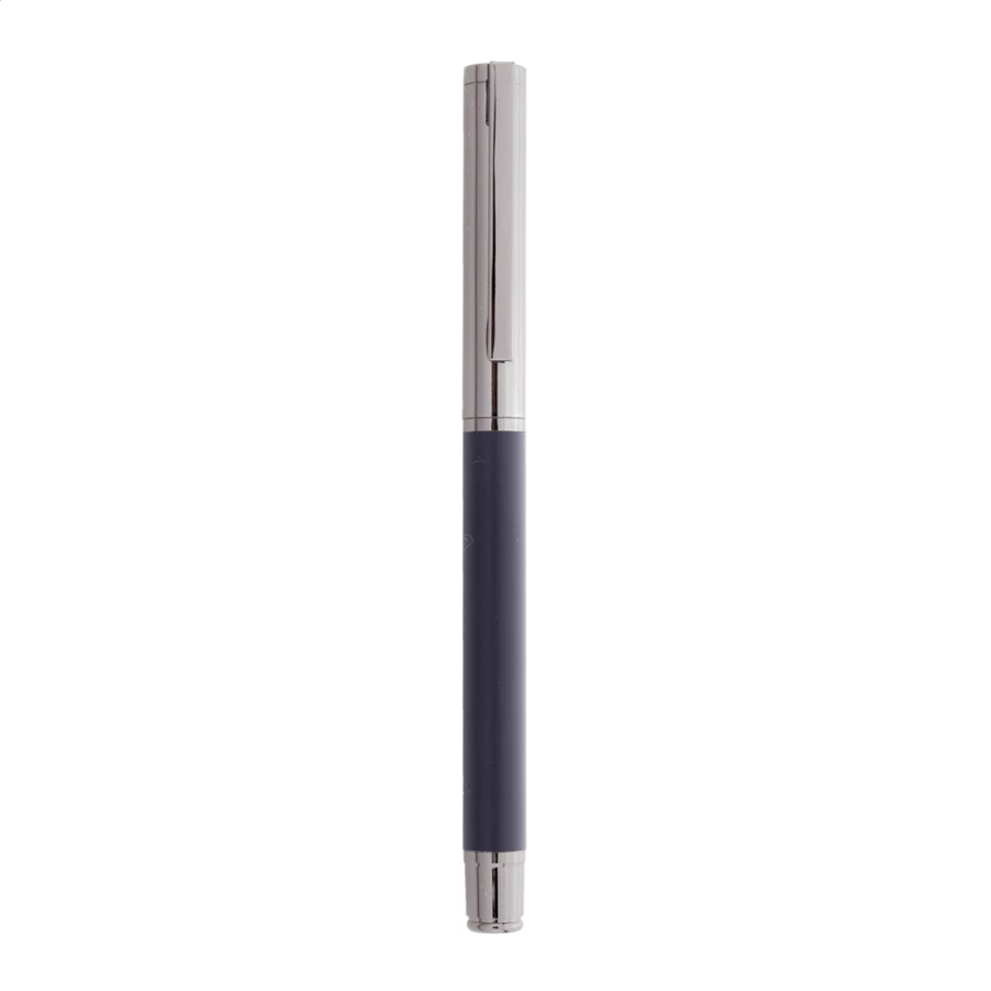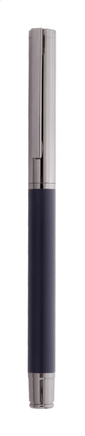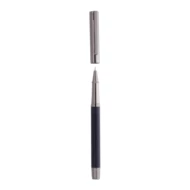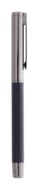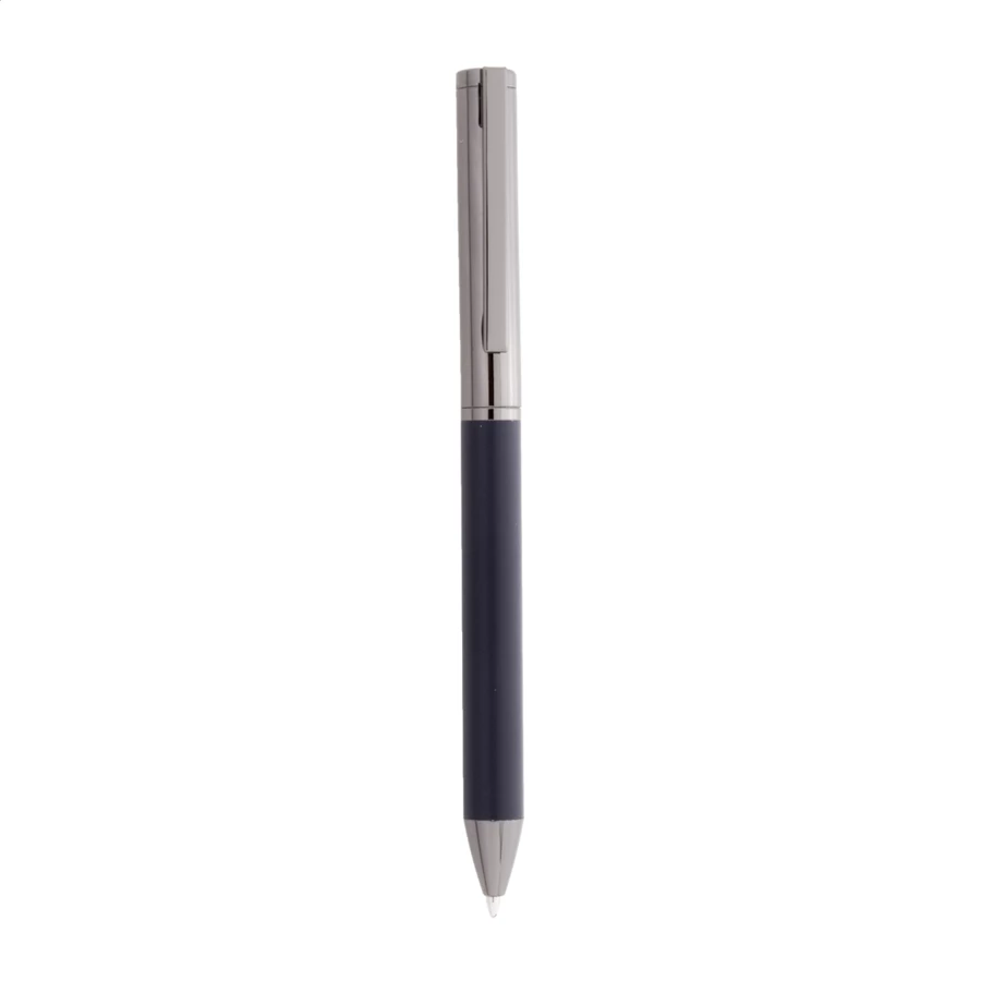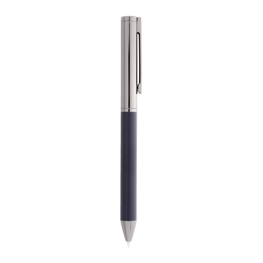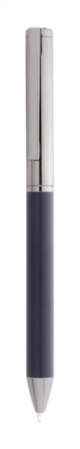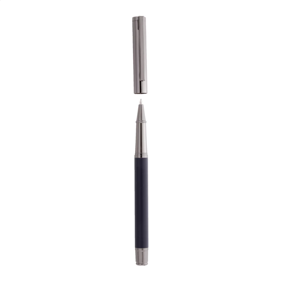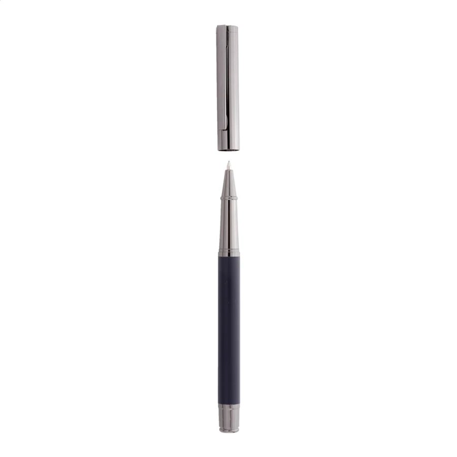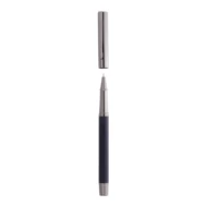 Elegancki metalowy zestaw składający się z długopisu i pióra kulkowego w czarnym papierowym pudełku upominkowym. Z niebieskim wkładem.