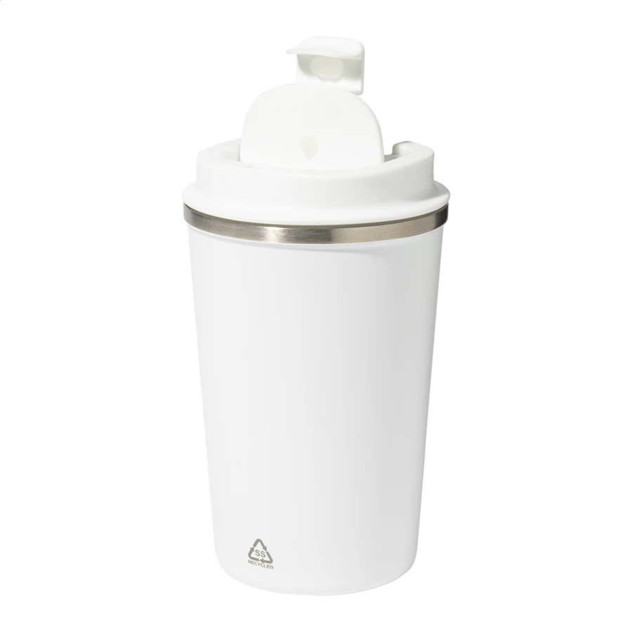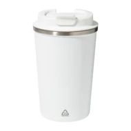 Kubek termiczny z podwójnymi ściankami, wykonany ze stali nierdzewnej z recyklingu, z pokrywką z PP. Pojemność 350 ml.