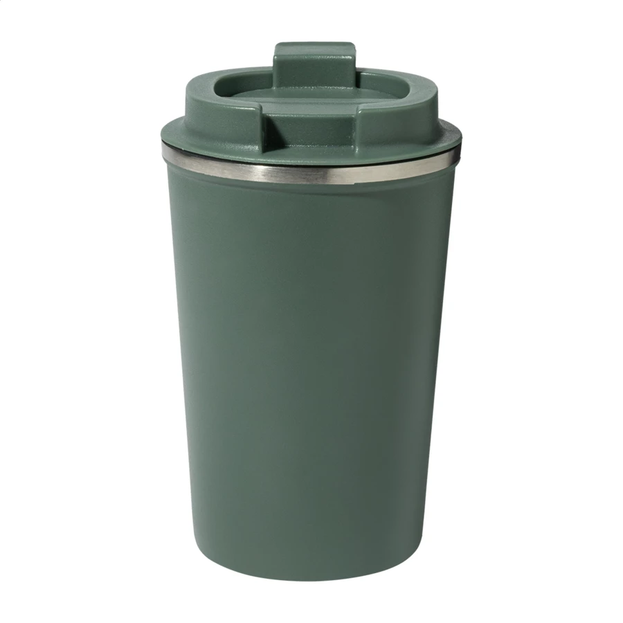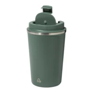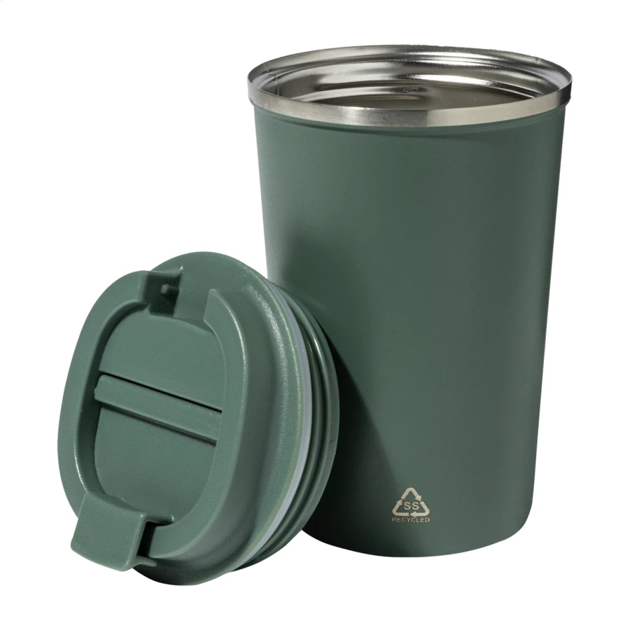 Kubek termiczny z podwójnymi ściankami, wykonany ze stali nierdzewnej z recyklingu, z pokrywką z PP. Pojemność 350 ml.