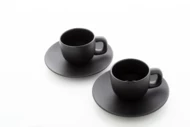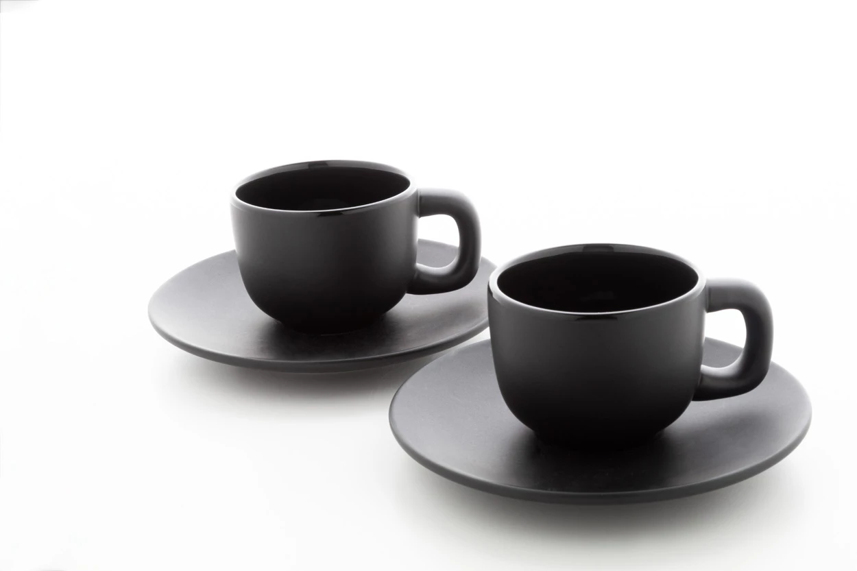 Wysokiej jakości ceramiczny zestaw filiżanek do espresso składający się z 2 filiżanek i spodków. Z matowym wykończeniem na zewnątrz i błyszczącym wykończeniem wewnątrz. 85ml. W pudełku z papieru kraft.