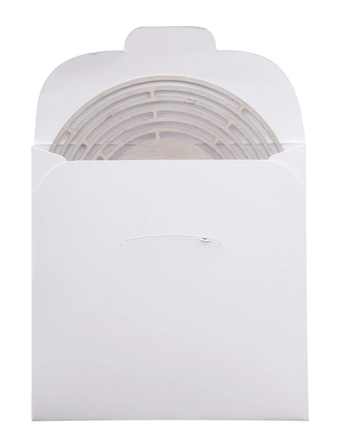 Stojak na świeczkę ze stali nierdzewnej w papierowym etui. Dostarczany na płasko, bez świeczki.