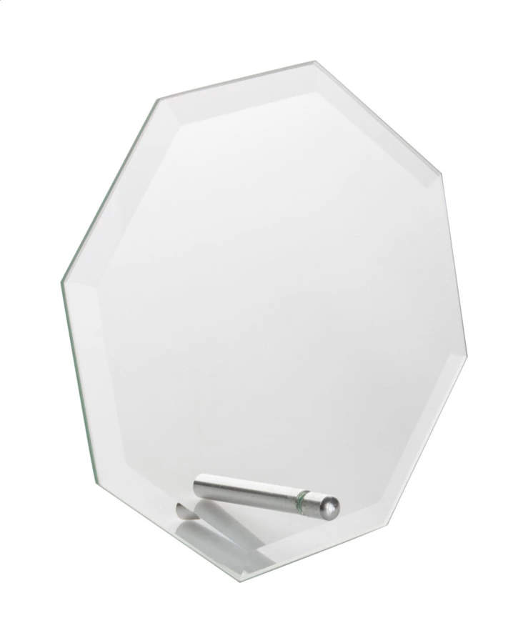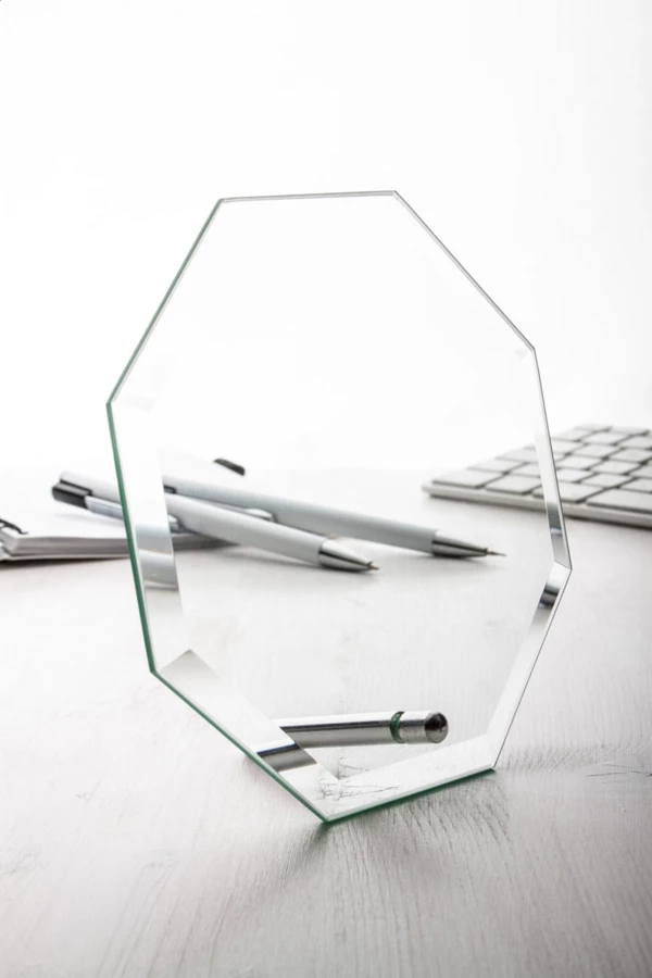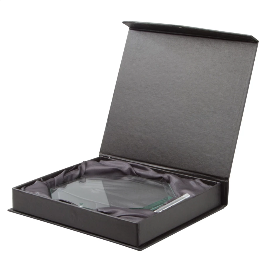 Ośmioboczny szklane trofeum w czarnym, ozdobnym opakowaniu.