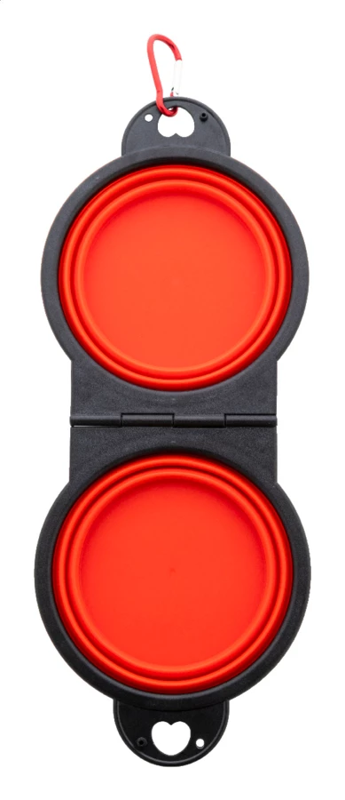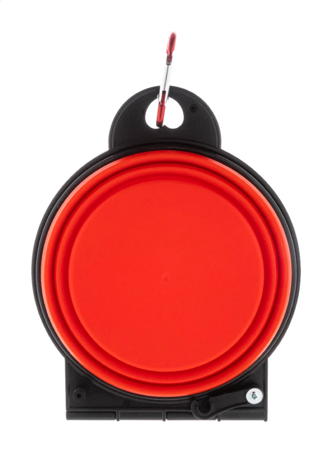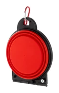 Składana miska dla zwierząt wykonana z wytrzymałego tworzywa TPE z dwiema przegrodami o pojemności 450 ml i dopasowanym kolorystycznie aluminiowym karabińczykiem.