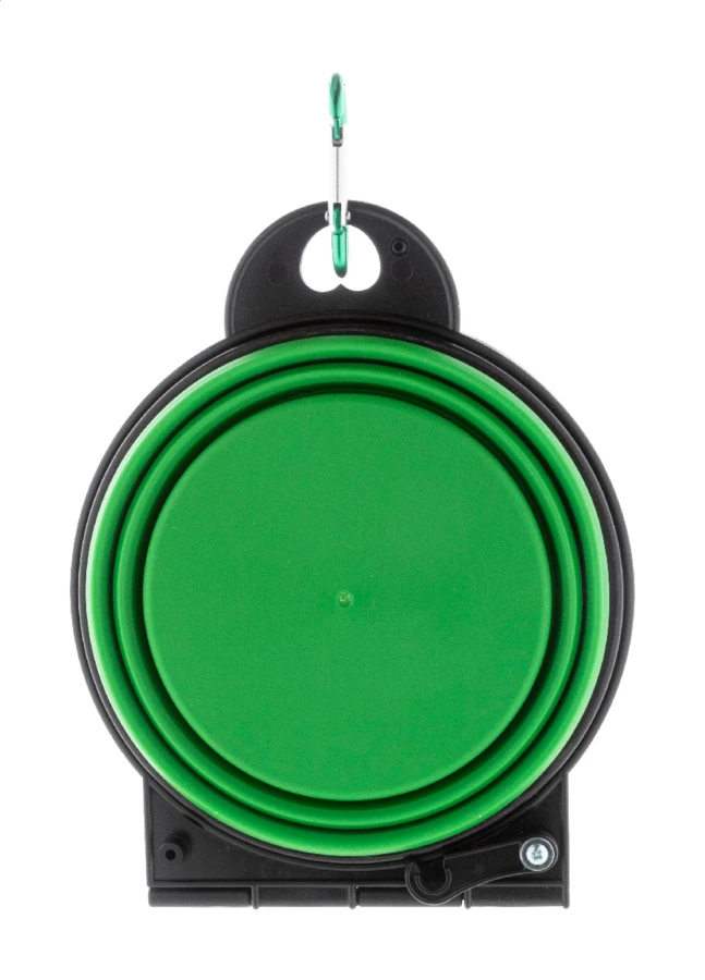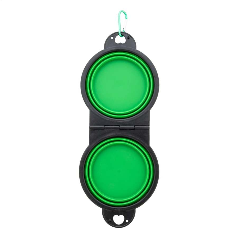 Składana miska dla zwierząt wykonana z wytrzymałego tworzywa TPE z dwiema przegrodami o pojemności 450 ml i dopasowanym kolorystycznie aluminiowym karabińczykiem.