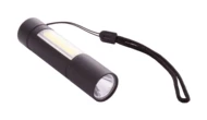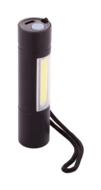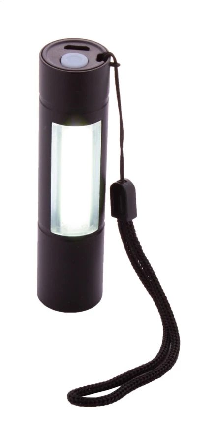 Aluminiowa latarka z wbudowanym akumulatorem USB (400 mAh) i paskiem do noszenia. Ze światłem COB o dużej mocy i reflektorem COB z boku. Z trybami światła stałego i migającego. W zestawie kabel do ładowarki USB.