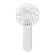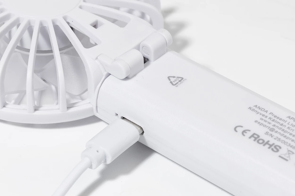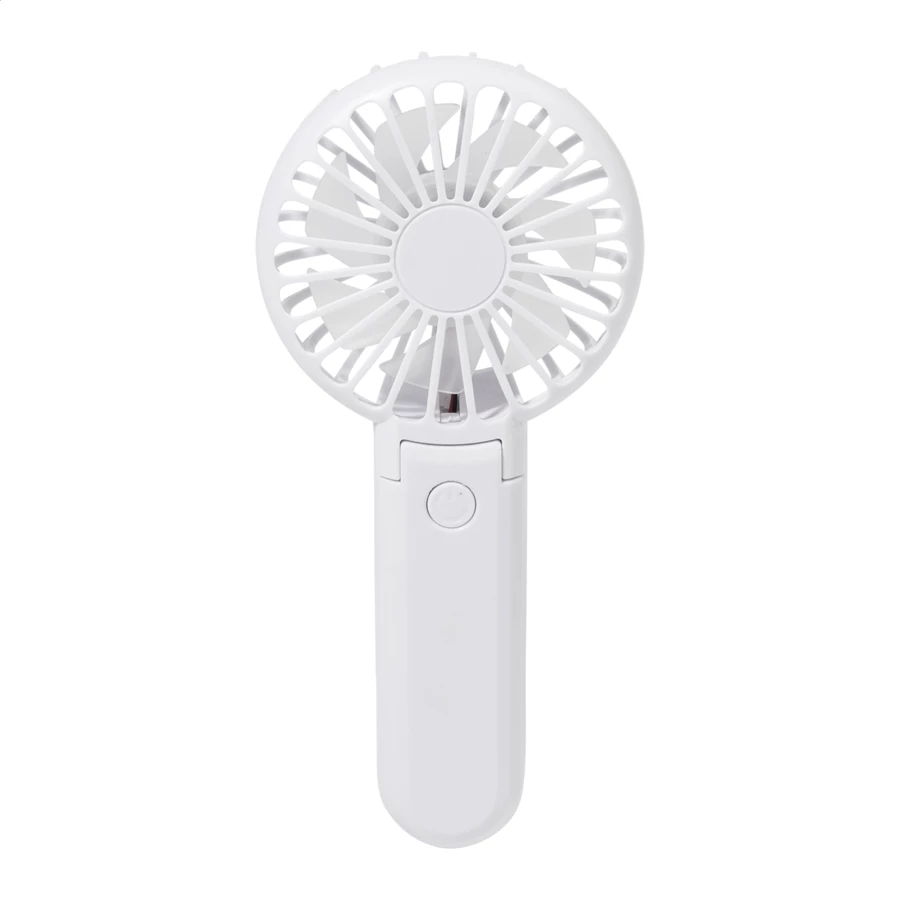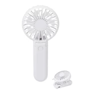 Elektryczny wentylator ręczny z recyklingowanego ABS z wbudowanym akumulatorem ładowanym przez USB (400 mAh). Z regulowanym kątem nachylenia głowicy i 3 ustawieniami prędkości. W zestawie kabel USB do ładowania.