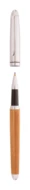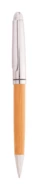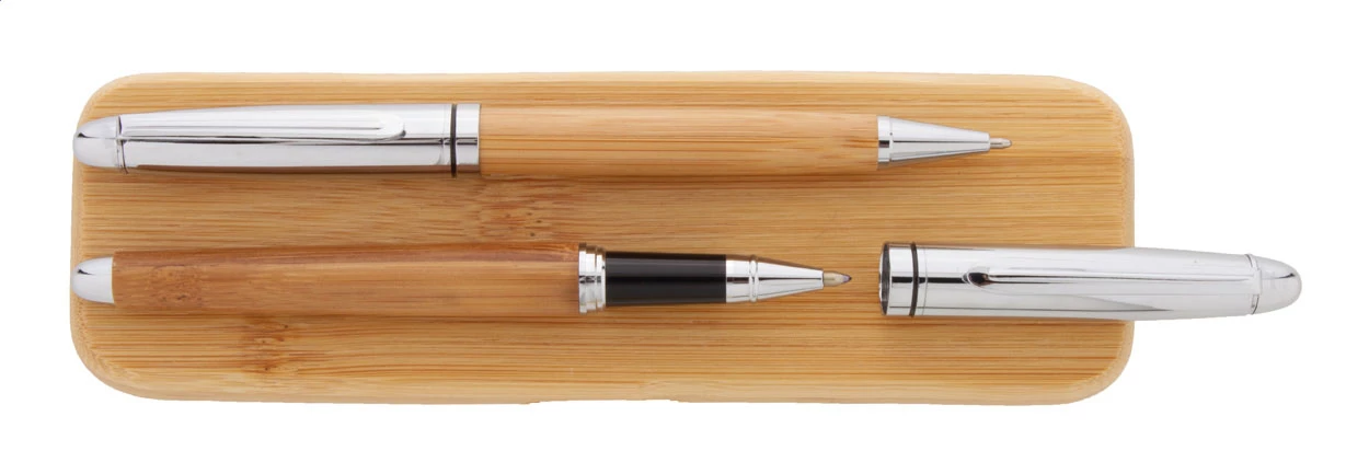 Elegancki, bambusowo-metalowy zestaw składający się z długopisu i pióra kulkowego w bambusowym etui. Z niebieskim wkładem.