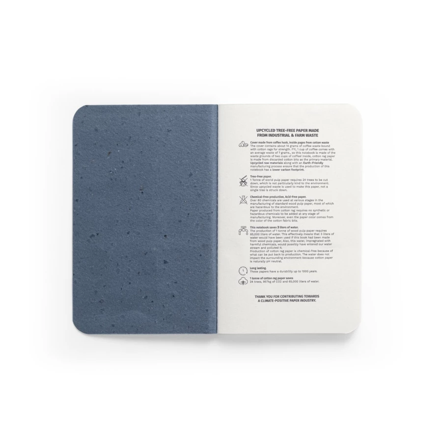 Notatnik A6 z elastyczną okładką wykonaną z odpadów z łusek kawy (65%) i odpadów bawełnianych (35%). Papier wewnętrzny wykonany jest z odpadów bawełnianych (100%) i jest bardzo trwały. Zawiera 52 zwykłe strony i papierową opaskę z grafiką. W procesie produkcji tego notatnika nie powstały żadne odpady, ani nie użyto żadnych środków chemicznych czy drzew. Ponieważ produkt jest wykonany z naturalnych materiałów, kolor produktu oraz wynik drukowania mogą się różnić w zależności od produktu. 100 x 145 mm
