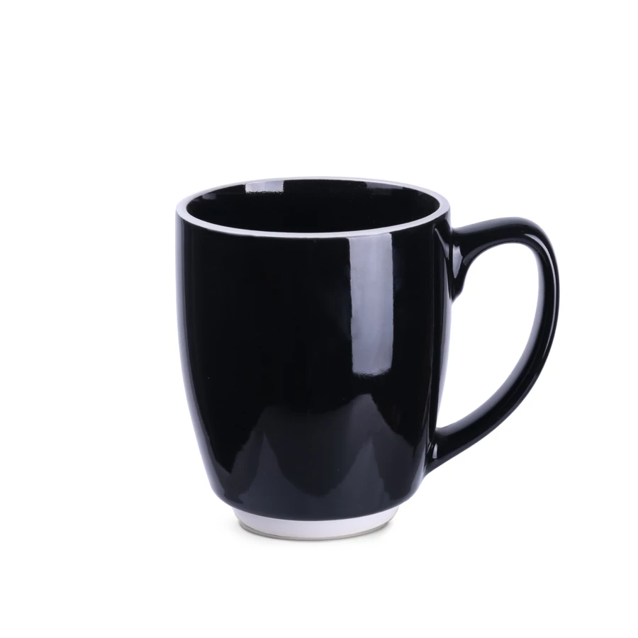 Designerski czarny kubek reklamowy o obłym kształcie z charakterystycznymi białymi wykończeniami na rancie oraz w dolnej części. Model o dużej pojemności.