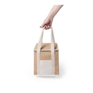 Zapinana na zamek torba termoizolacyjna z laminowanej juty i bawełny z aluminiową wyściółką. Z przednią kieszenią z bawełny idealnej do nadruku.
