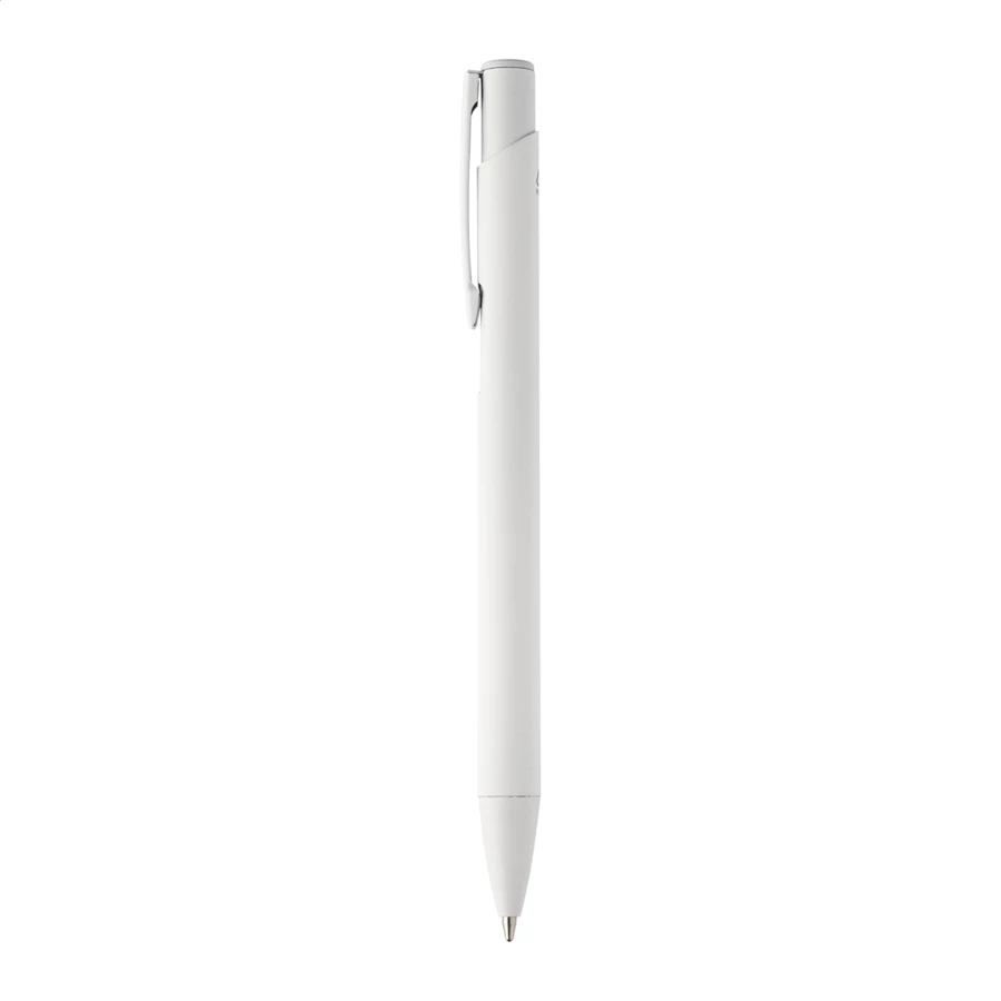 Długopis z recyklingowanego aluminium z gumowaną obudową i dopasowanymi kolorami. Z niebieskim wkładem.