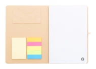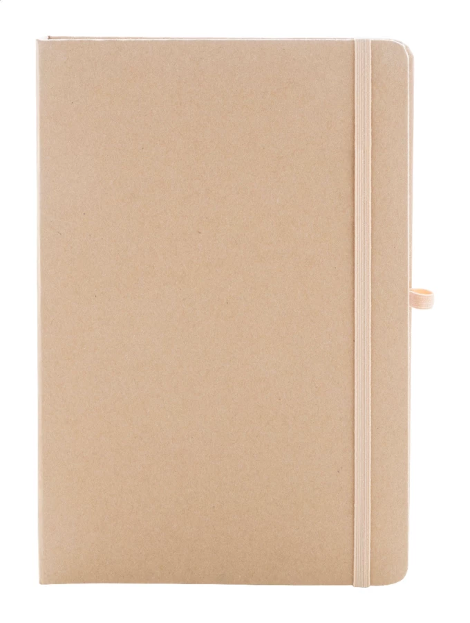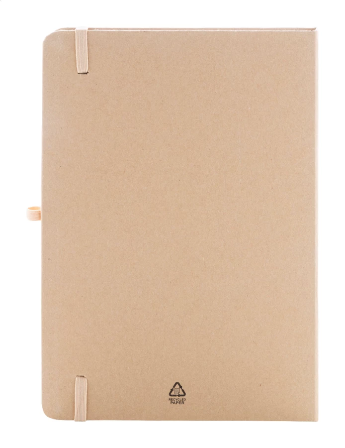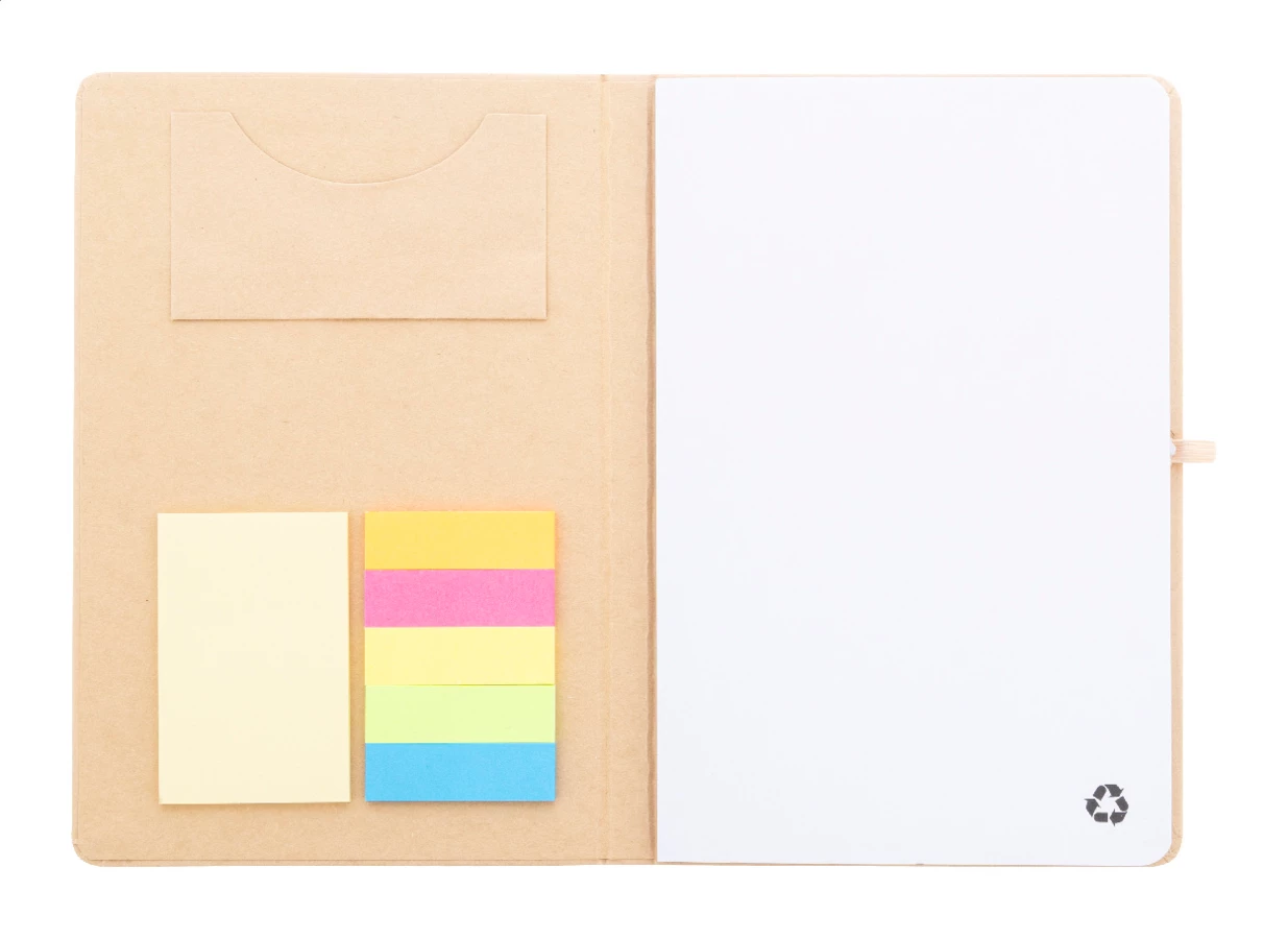 Notes w okładce z recyklingowanego kartonu, z 70 czystymi kartkami z papieru z recyklingu. Wewnątrz okładka zawiera 25 karteczek samoprzylepnych, 125 zakładek i kieszonkę na karty. Z gumowym paskiem i uchwytem na długopis. Format A5.