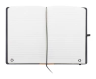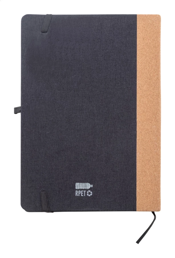 Notes z okładką z poliestru RPET z naturalnym korkowym grzbietem i 80 kartkami w linie z papieru pochodzącego z recyklingu. Z zakładką, gumowym paskiem i uchwytem na długopis. Rozmiar A5.