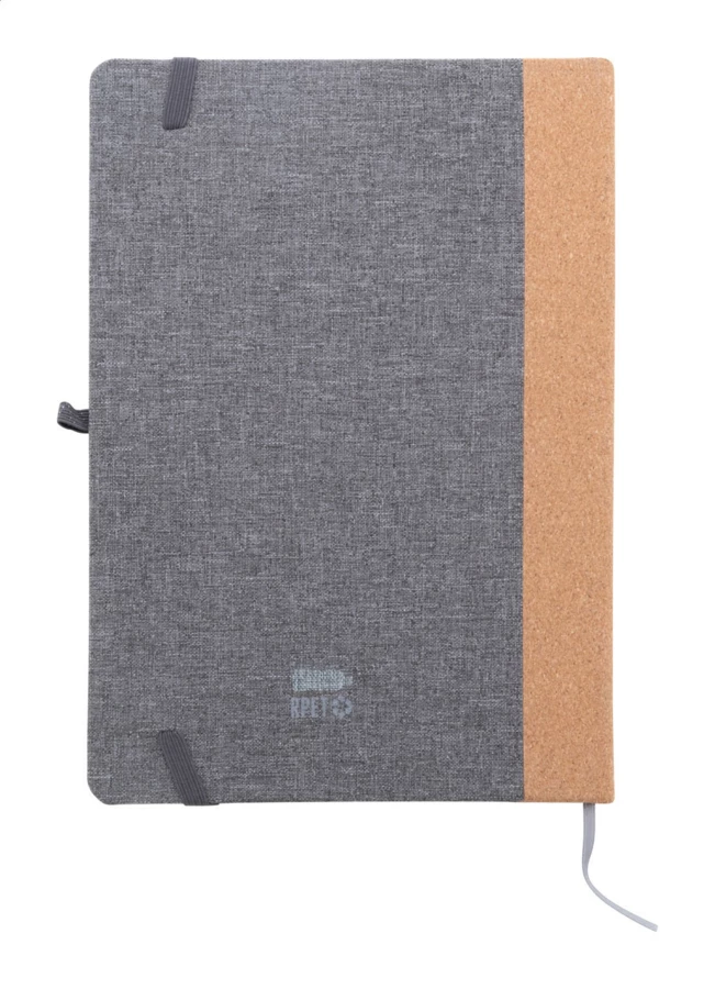 Notes z okładką z poliestru RPET z naturalnym korkowym grzbietem i 80 kartkami w linie z papieru pochodzącego z recyklingu. Z zakładką, gumowym paskiem i uchwytem na długopis. Rozmiar A5.