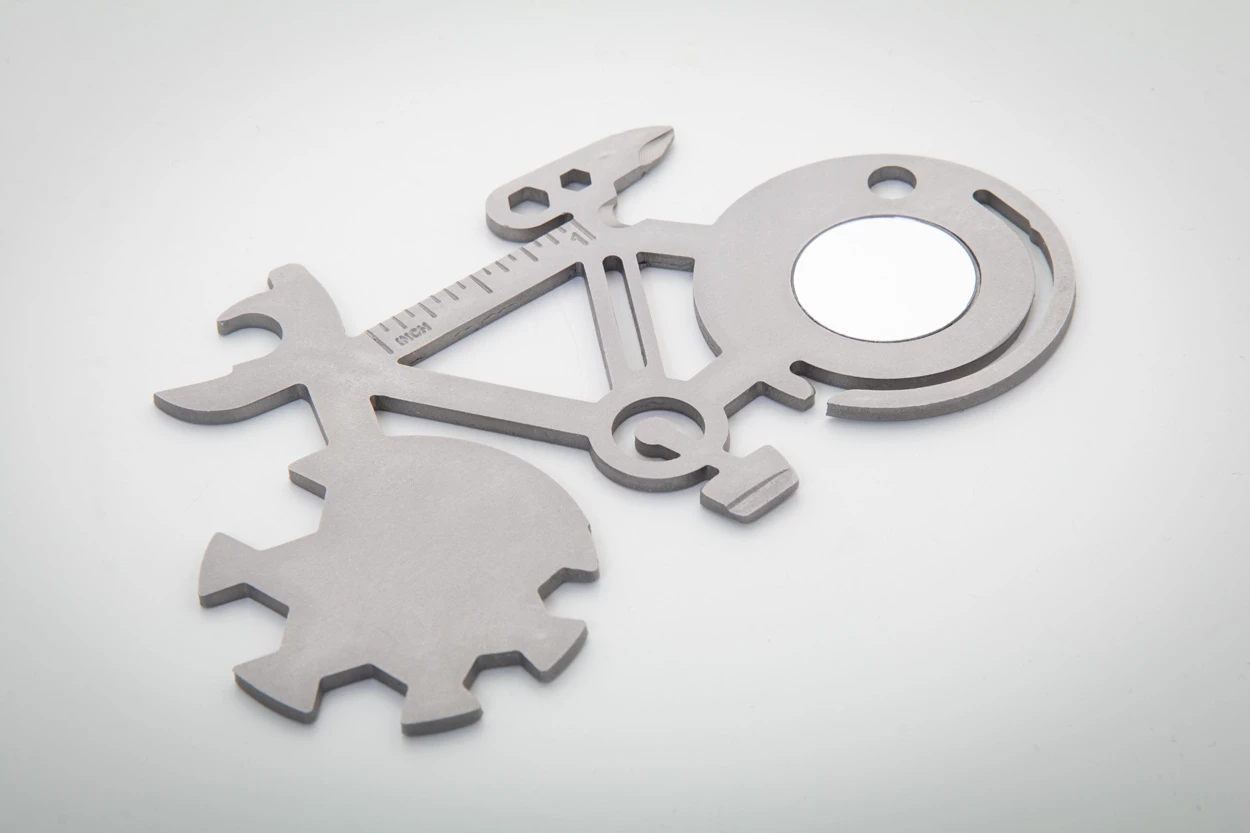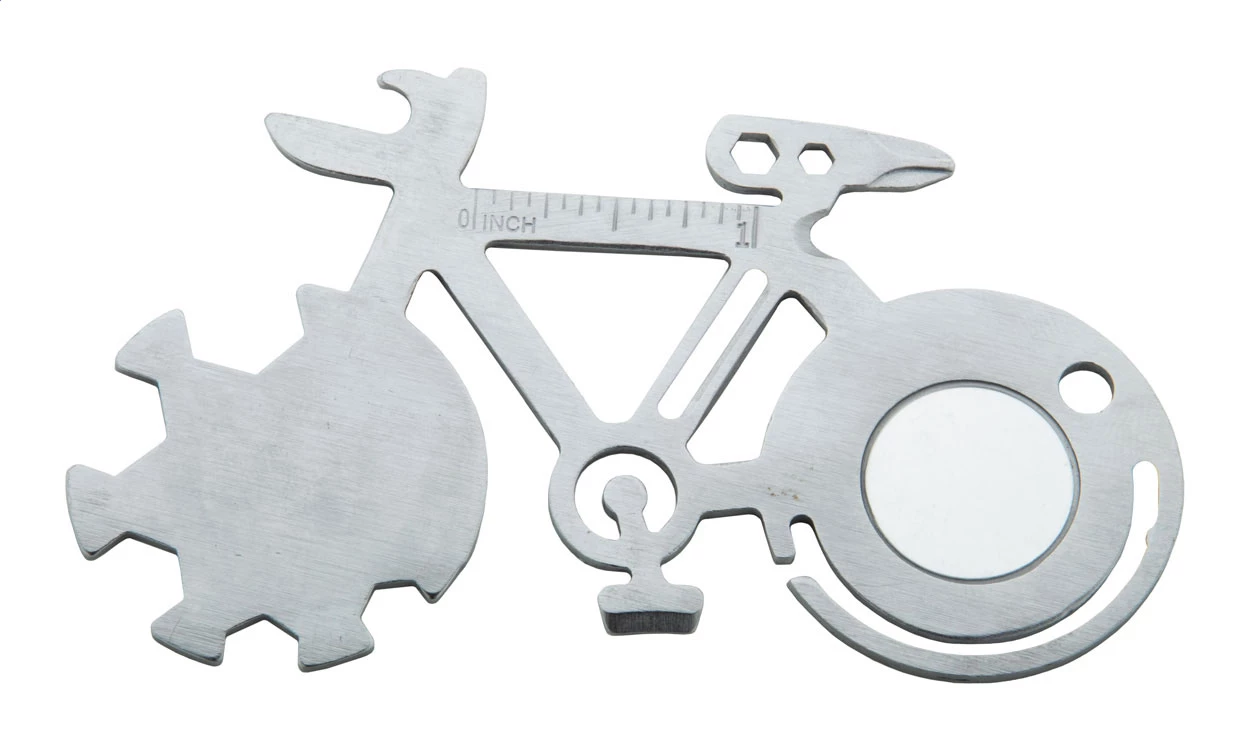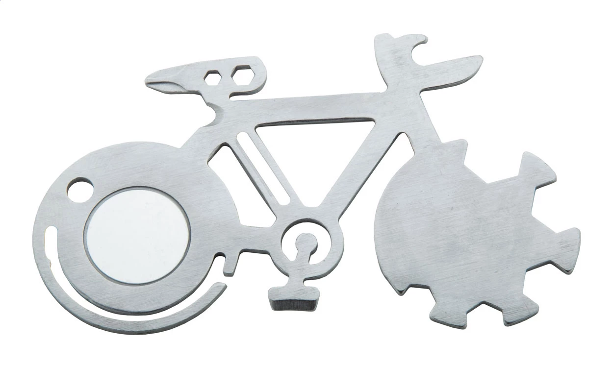 Narzędzie wielofunkcyjne ze stali nierdzewnej w kształcie roweru z 11 funkcjami.