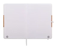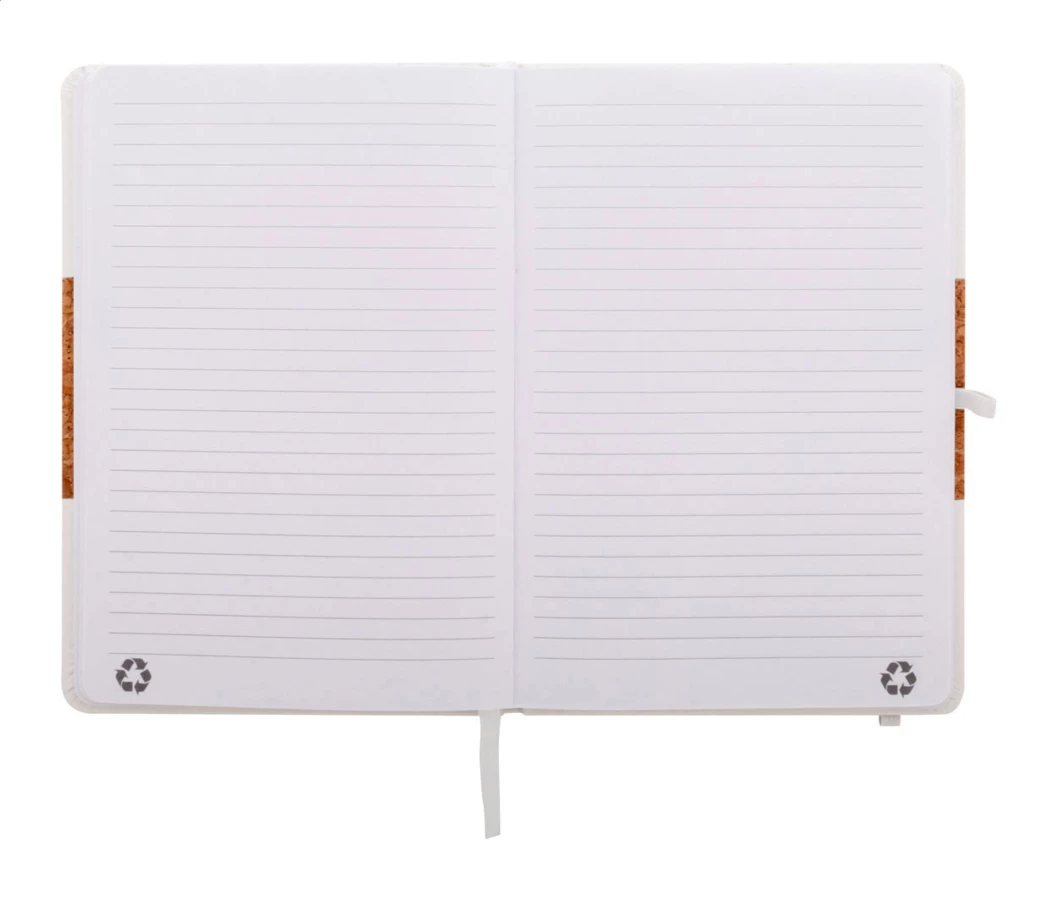 Notes z okładką pokrytą naturalnym korkiem i skórą PU z recyklingu, z dopasowaną kolorową zakładką, elastyczną opaską i uchwytem na długopis. Zawiera 80 kartek w linie z papieru makulaturowego. Rozmiar A5.