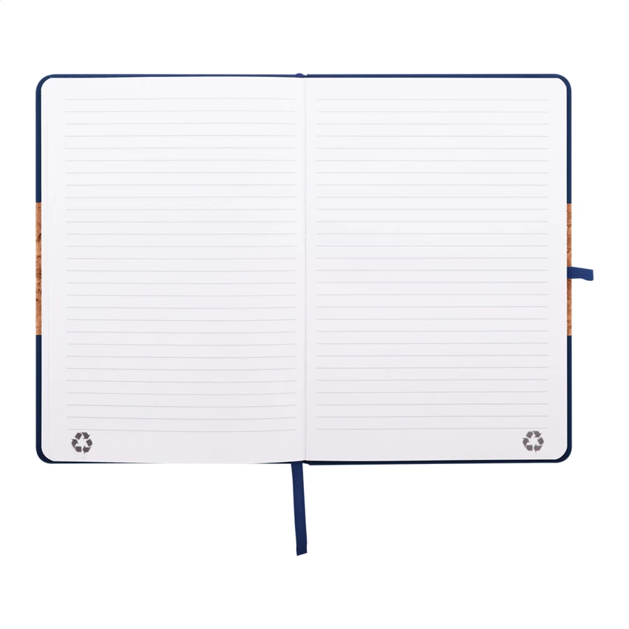 Notes z okładką pokrytą naturalnym korkiem i skórą PU z recyklingu, z dopasowaną kolorową zakładką, elastyczną opaską i uchwytem na długopis. Zawiera 80 kartek w linie z papieru makulaturowego. Rozmiar A5.