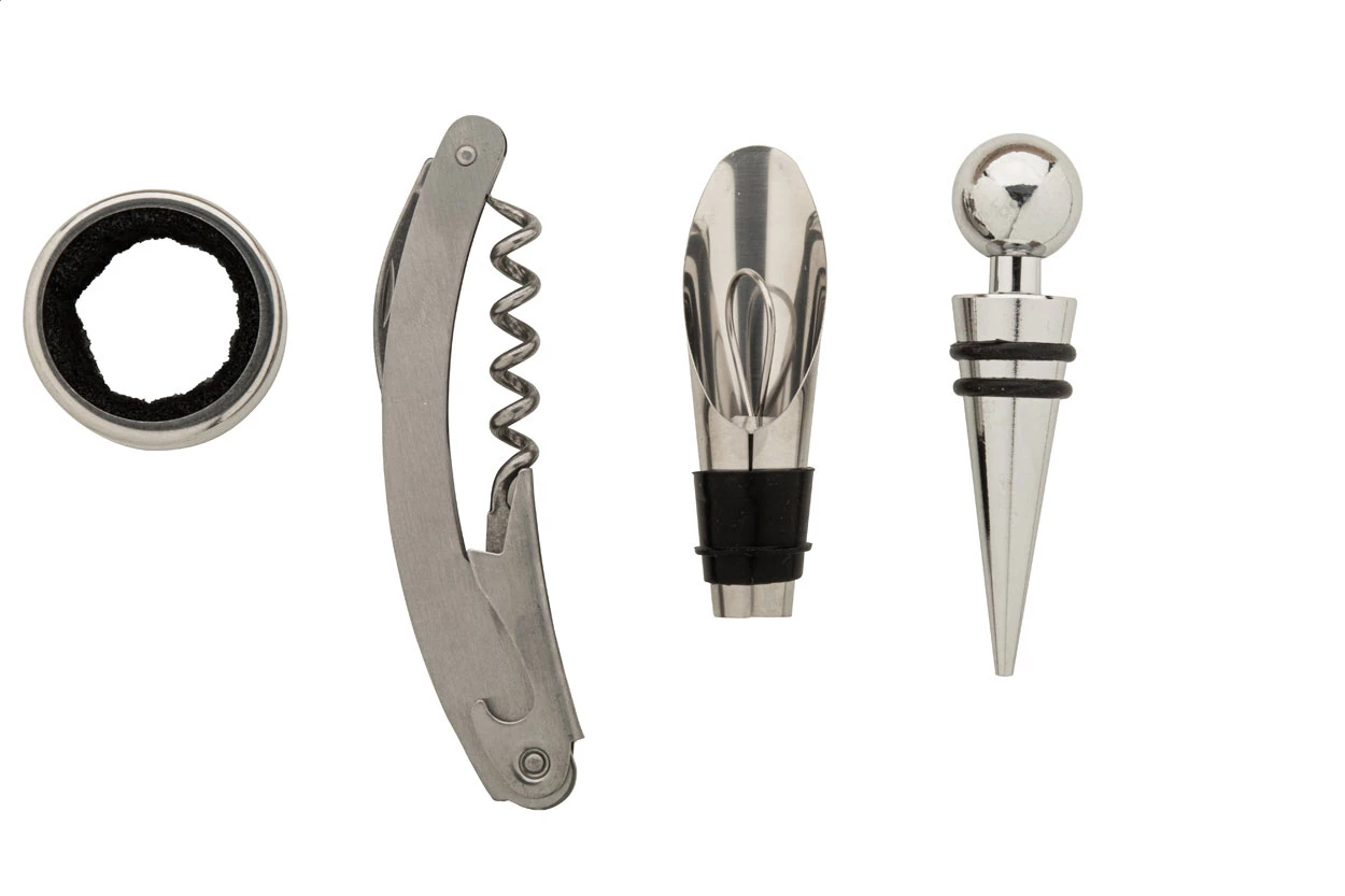 4-częściowy zestaw do wina ze stali nierdzewnej w bambusowym pudełku w kształcie butelki. Zawiera korkociąg, ociekacz, lejek i zatyczkę.