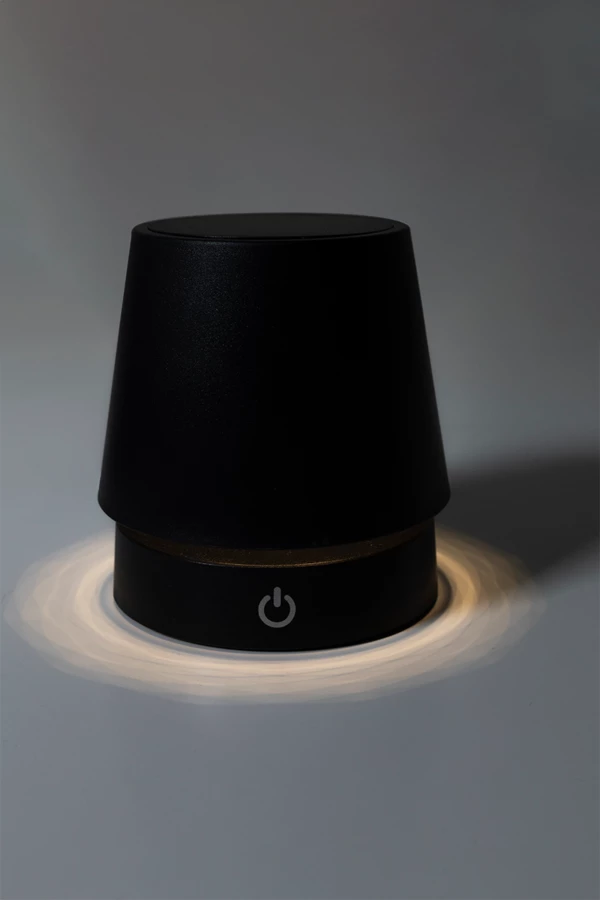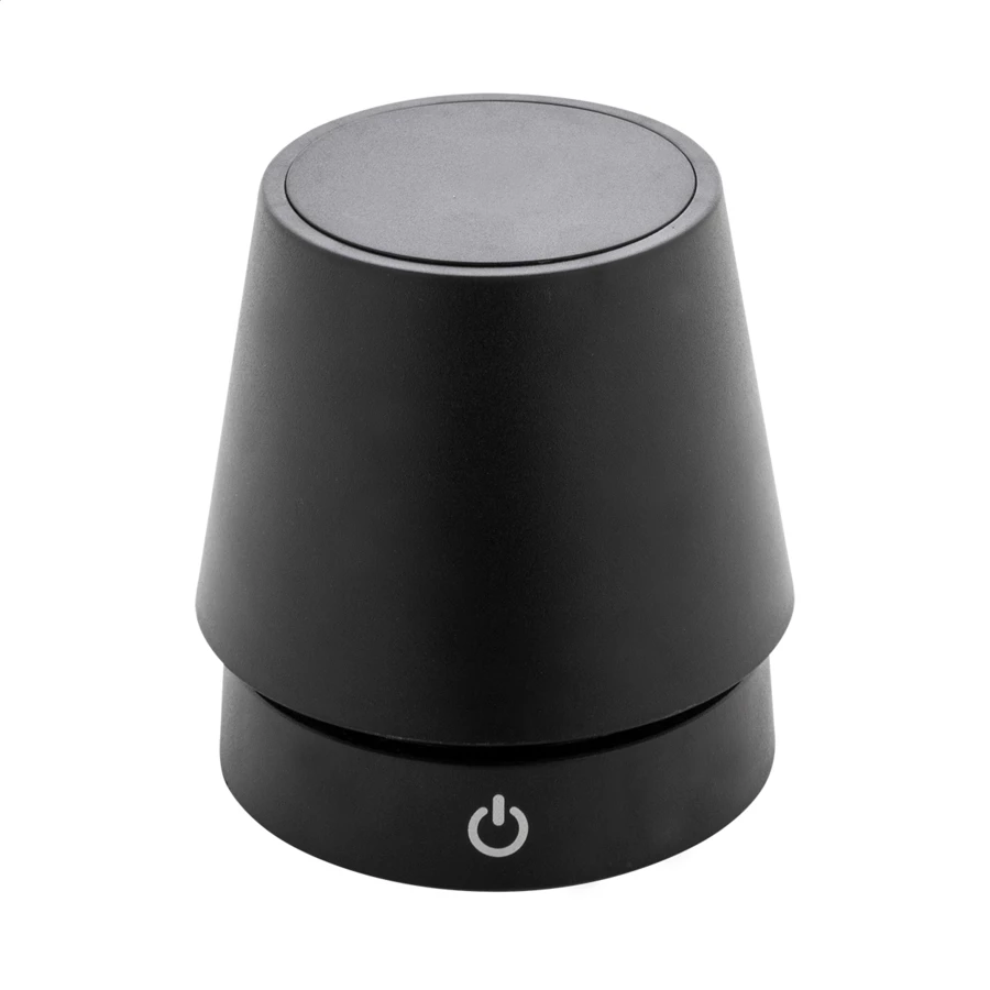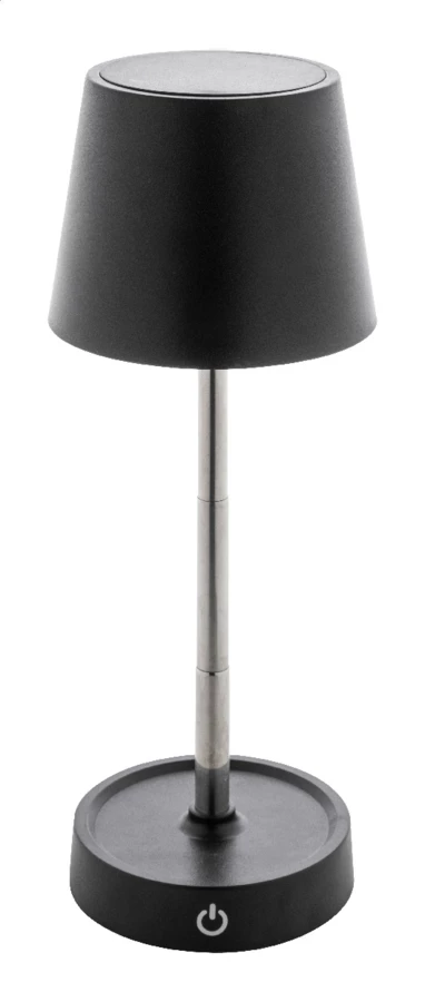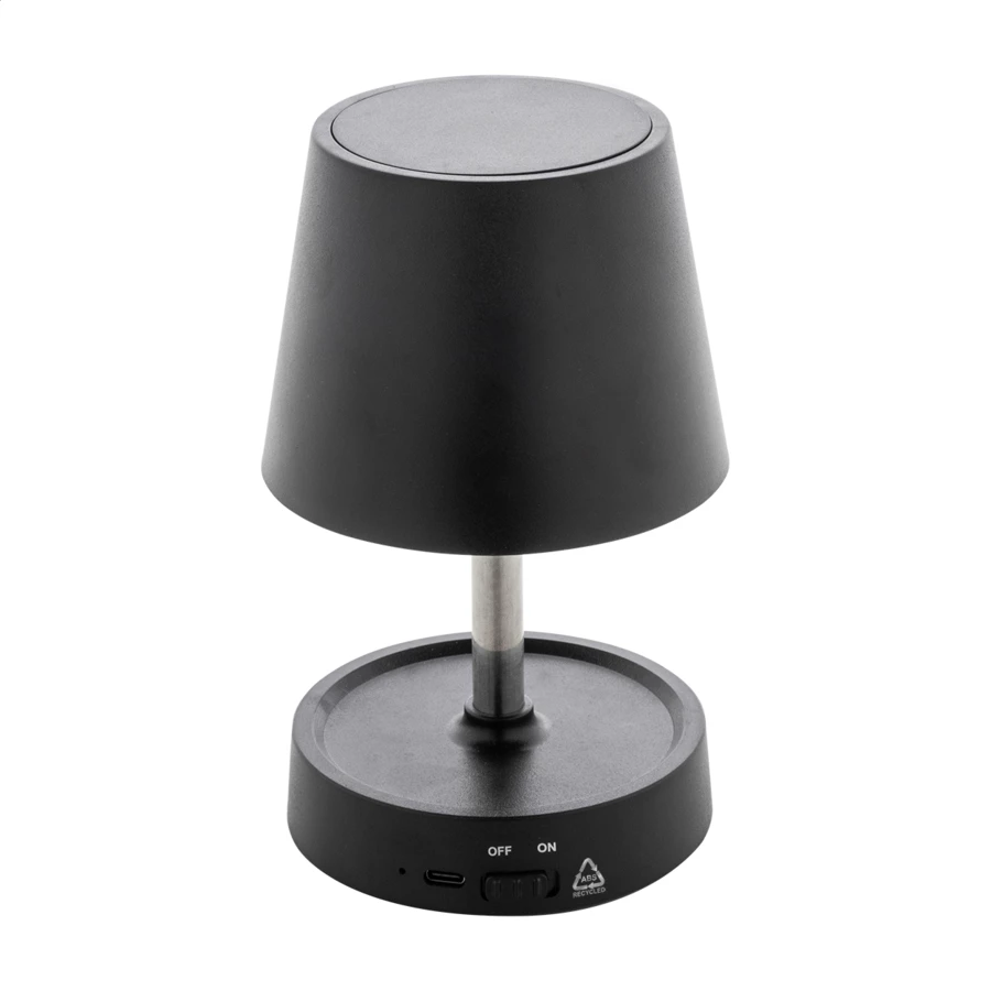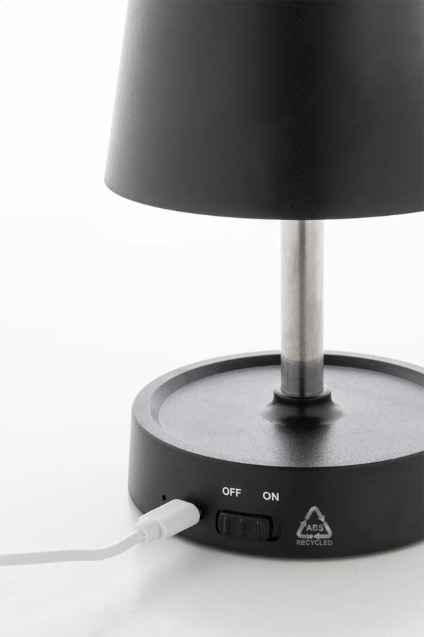 Teleskopowa lampa stołowa z recyklingowanego ABS z 12 diodami LED, regulowaną jasnością i akumulatorem USB o pojemności 1200 mAh. W zestawie kabel USB do ładowania.