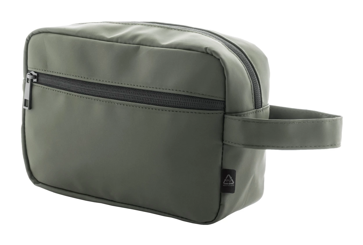 Miękka kosmetyczka z recyklingowanej skóry PU z dwoma przegrodami na suwak i uchwytem do przenoszenia. Z charakterystyczną metką z recyklingowanego PU.