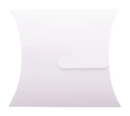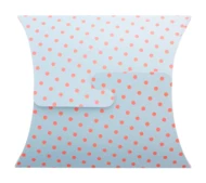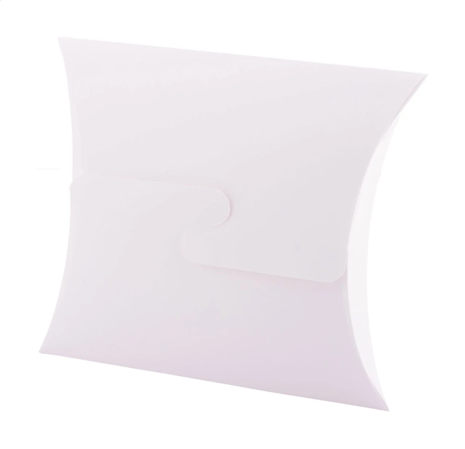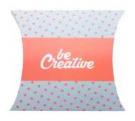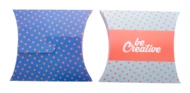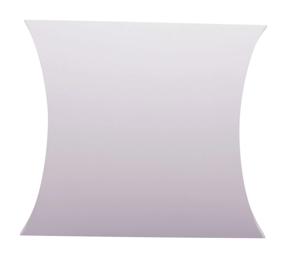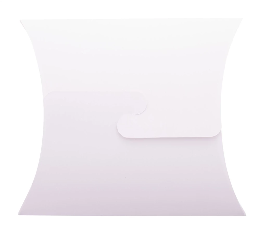 Personalizowane pudełko w kształcie poduszki z tektury z nadrukiem w full kolorze z przodu. Dostarczane na płasko. Min. ilość: 50 szt