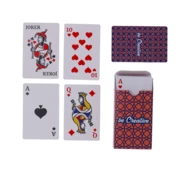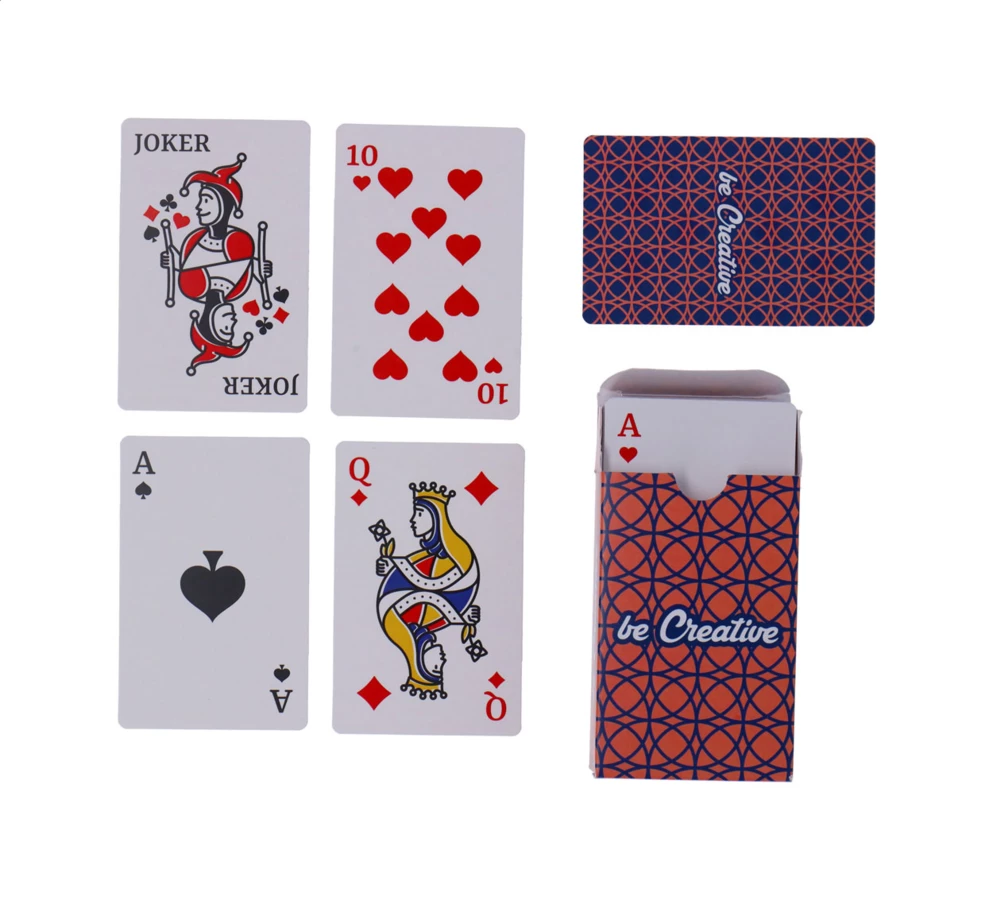 Wykonane na zamówienie, klasyczne karty do gry w papierowym pudełku. Jedna standardowa talia z 54 kartami. Cena obejmuje pudełko z nadrukiem w pełnym kolorze i identyczny nadruk w pełnym kolorze na odwrocie każdej karty. MOQ: 100 szt.