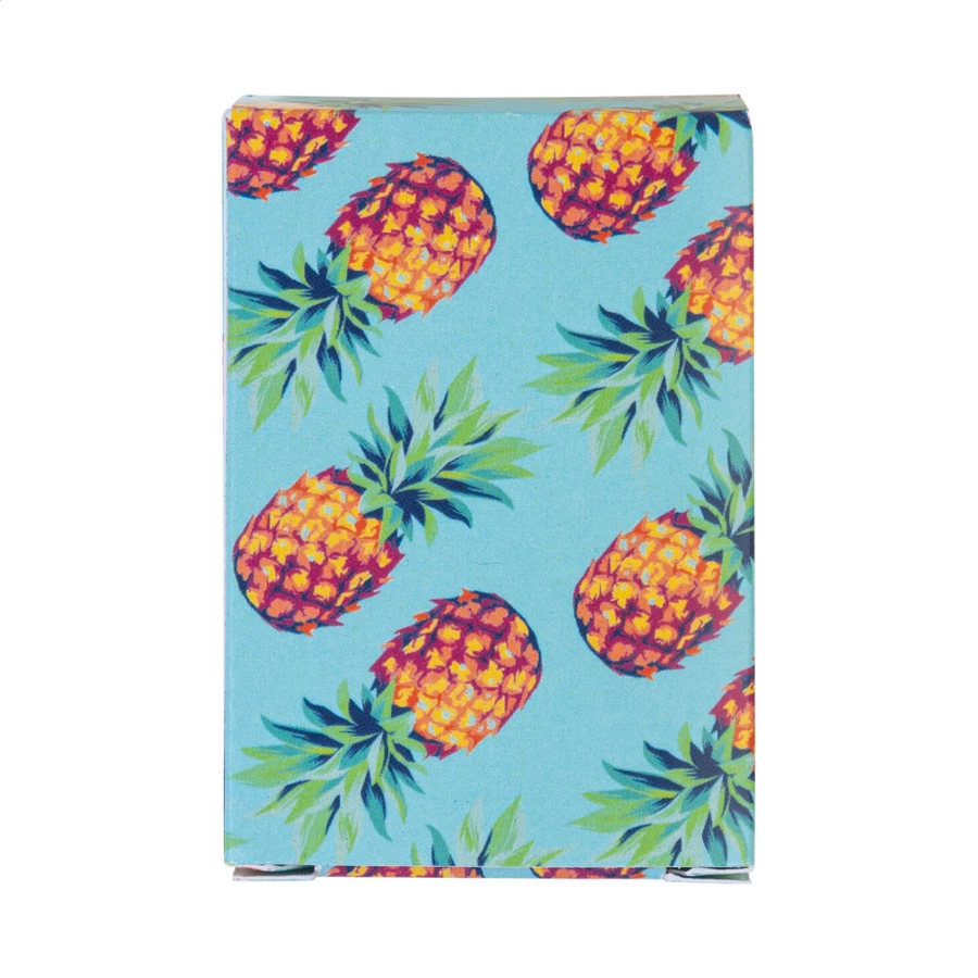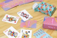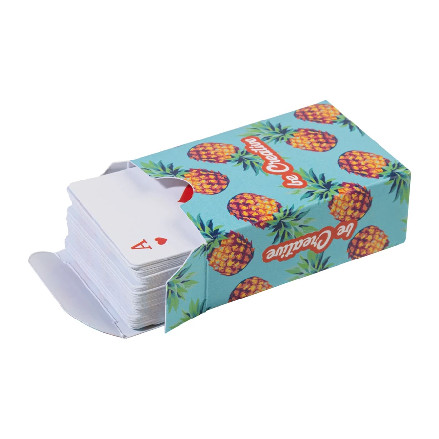 Klasyczne karty do gry w formacie mini, wykonane na zamówienie, w papierowym pudełku. Jedna standardowa talia z 54 kartami. Cena obejmuje pudełko z full kolorowym nadrukiem oraz identyczny kolorowy nadruk na odwrocie każdej karty. Min. ilość: 100 szt.